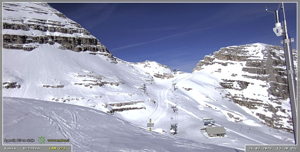 Archiviertes Webcam Bild: Skigebiet Sella Nevea - Bovec Kanin - Blick Richtung Nordwesten am 26 Feb 2026 um 14:10 Uhr 13:00