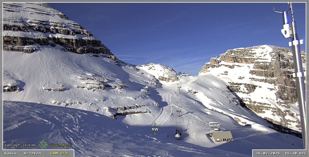 Archiviertes Webcam Bild: Skigebiet Sella Nevea - Bovec Kanin - Blick Richtung Nordwesten am 26 Feb 2026 um 16:10 Uhr Aktuell