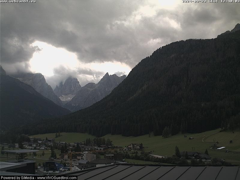 Webcam am Hotel Gruber in Sexten im Hochpustertal. Genieße stündlich den Ausblick von einem der Balkone auf das Dorf, die Sextner Sonnenuhr und die Rotwand.