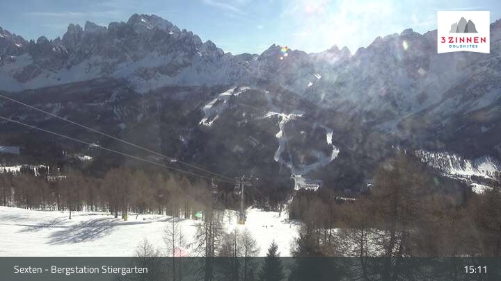 Archived webcam image showing Stiergarten Mountain, Sexten Dolomites on 26 Feb 2026 at 15:12 Aktuell