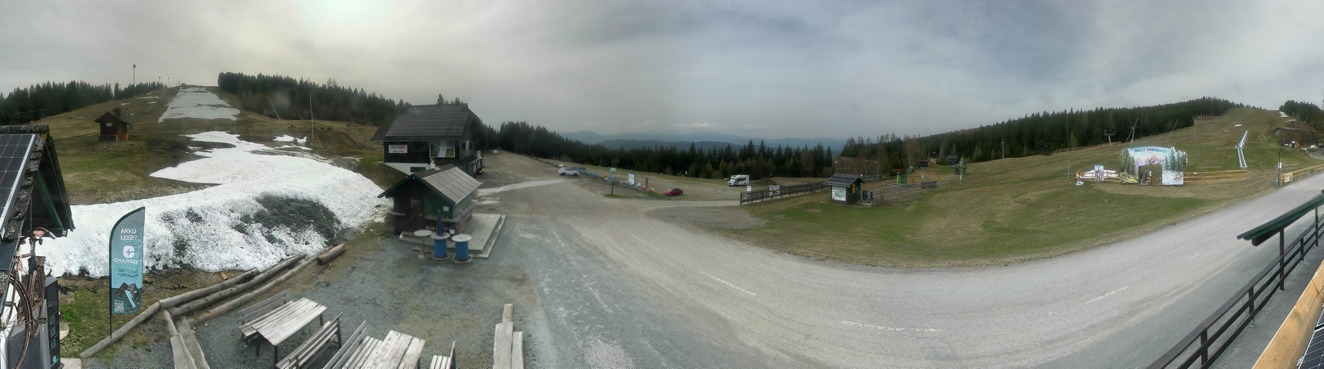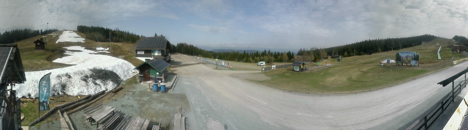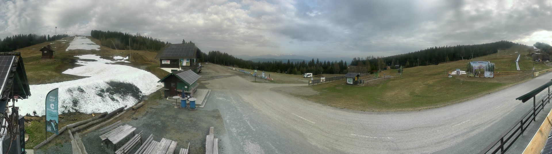 Panorama-Blick auf das Skigebiet auf der Simonhöhe in Kärnten, Österreich. Zu sehen sind unter anderem der Hochecklift und der Paulsberglift sowie die Ausschankhütte Talstation.