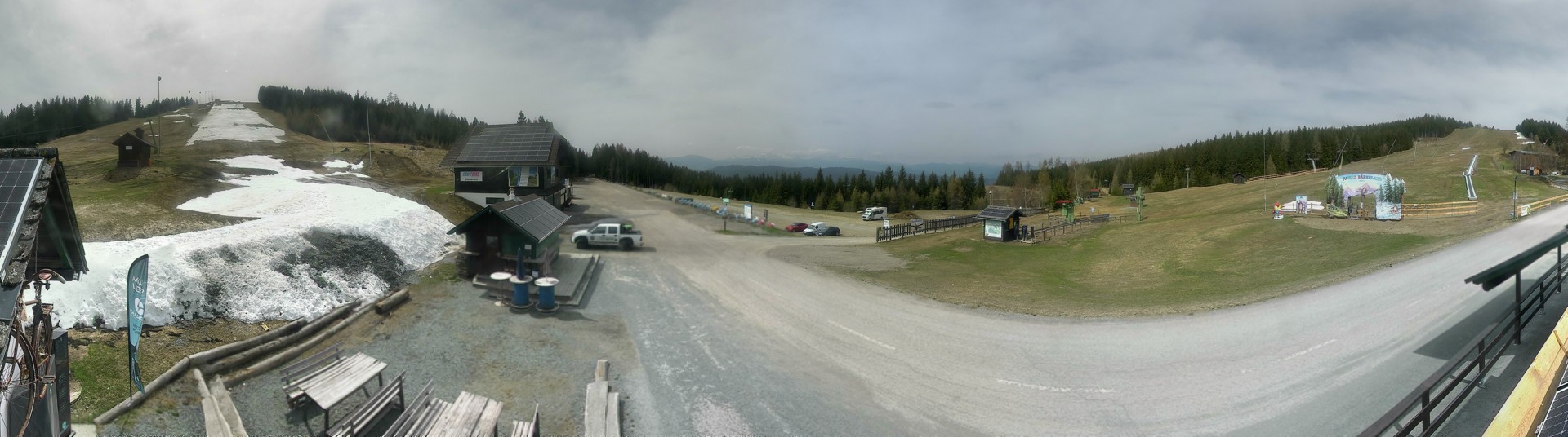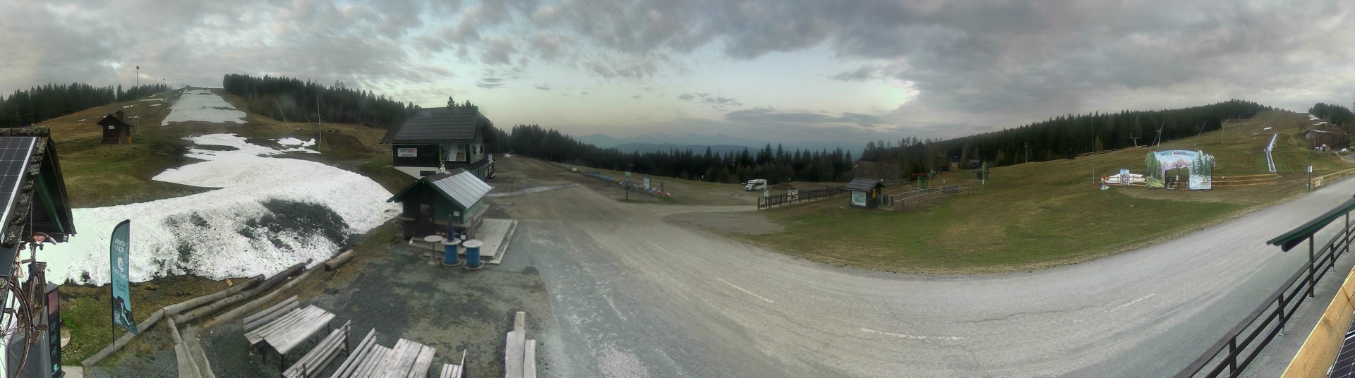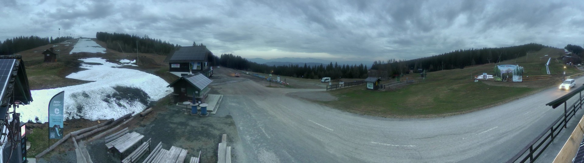 Panorama-Blick auf das Skigebiet auf der Simonhöhe in Kärnten, Österreich. Zu sehen sind unter anderem der Hochecklift und der Paulsberglift sowie die Ausschankhütte Talstation.