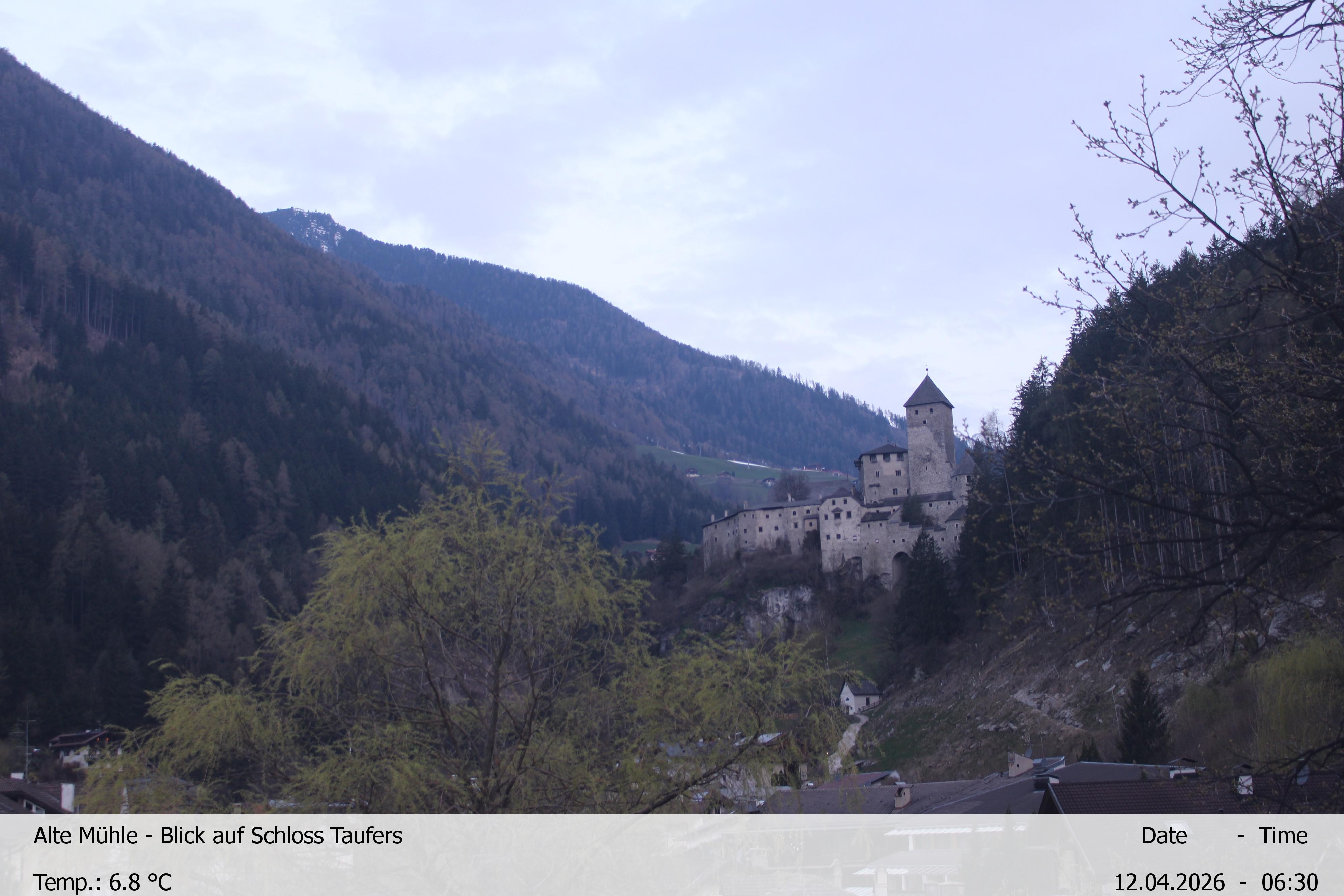 Archived webcam image showing View towards castle Taufers in South Tyrol on 12 Apr 2026 at 06:28 05:00