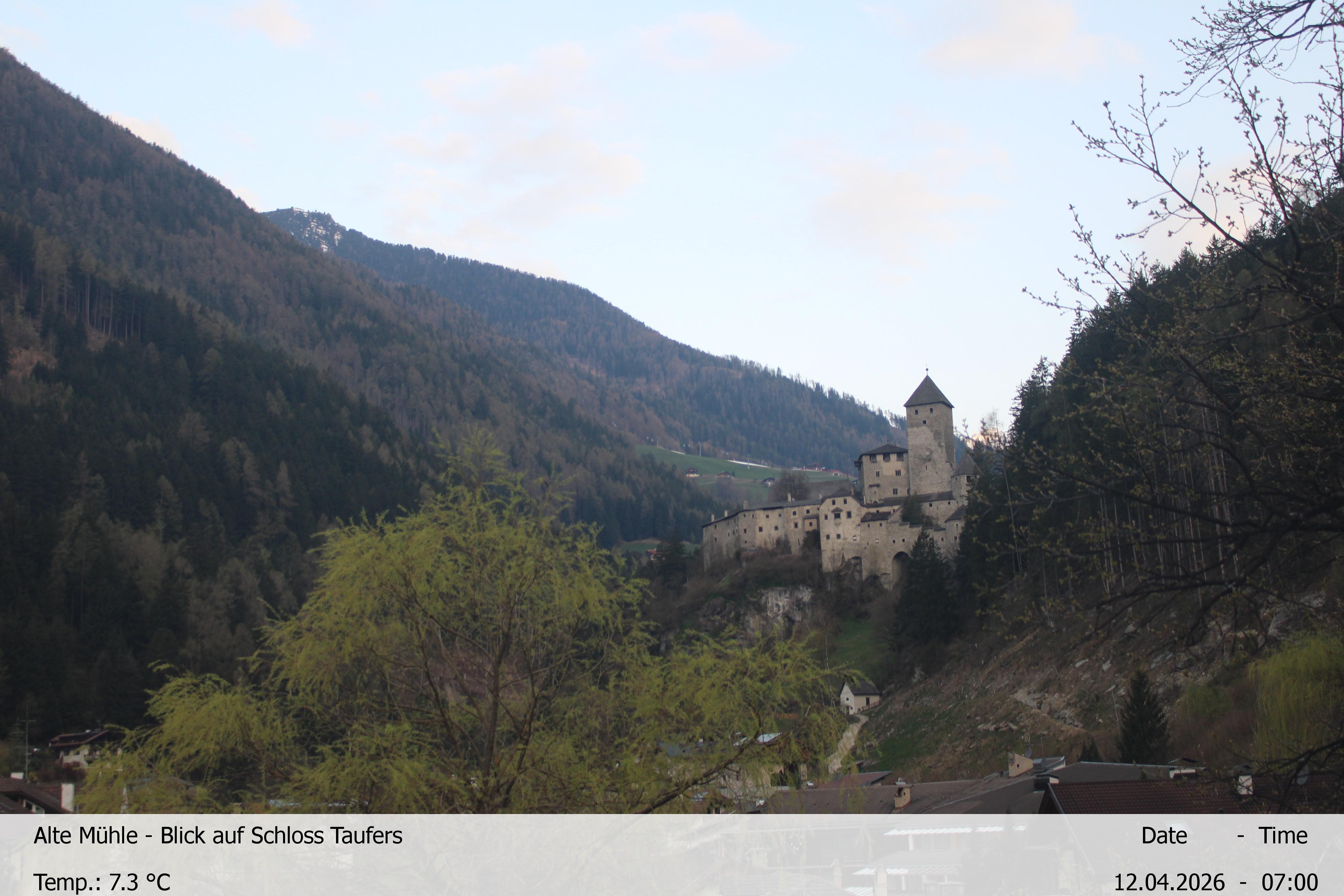 Archived webcam image showing View towards castle Taufers in South Tyrol on 12 Apr 2026 at 07:28 06:00