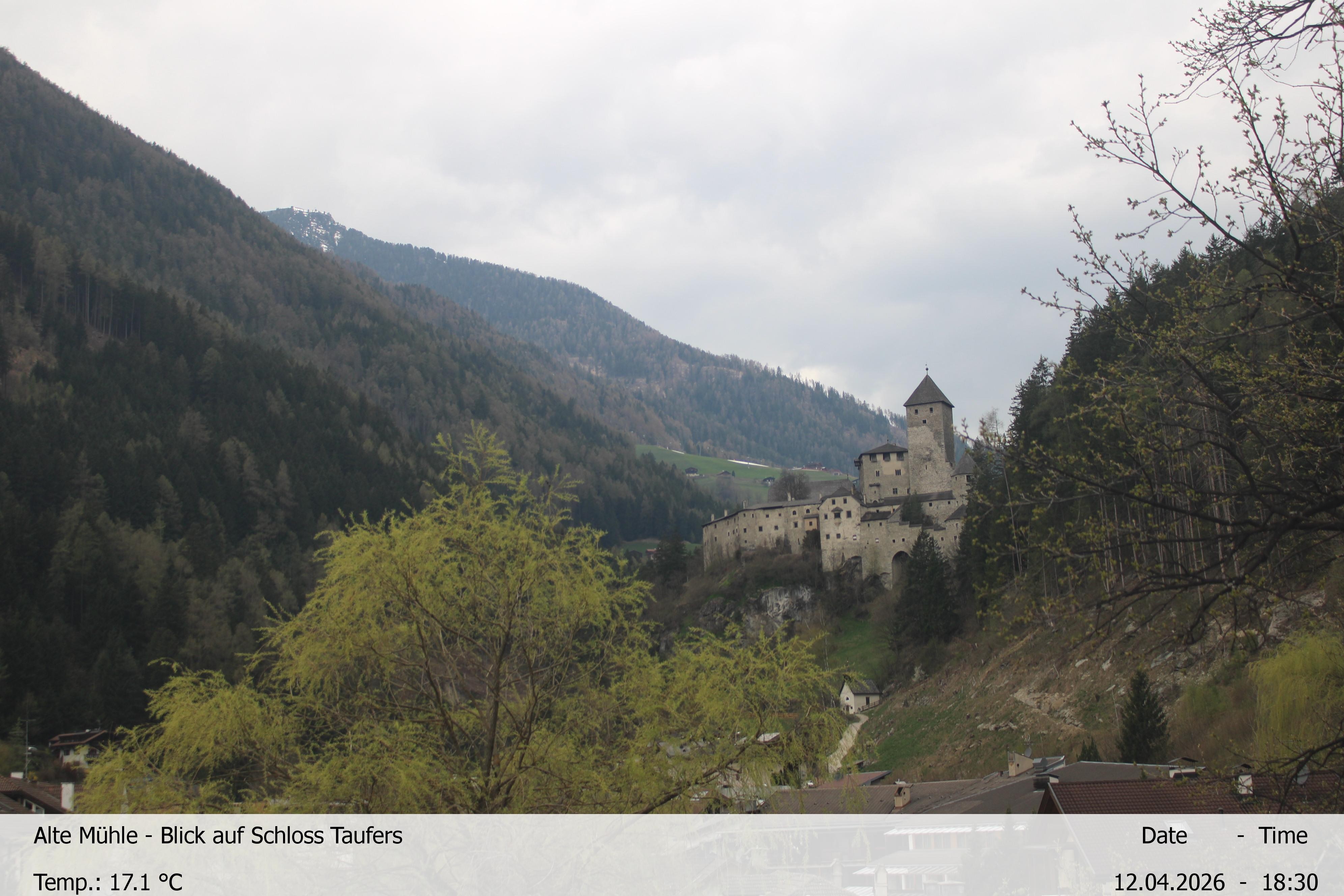 Archived webcam image showing View towards castle Taufers in South Tyrol on 12 Apr 2026 at 18:28 Aktuell