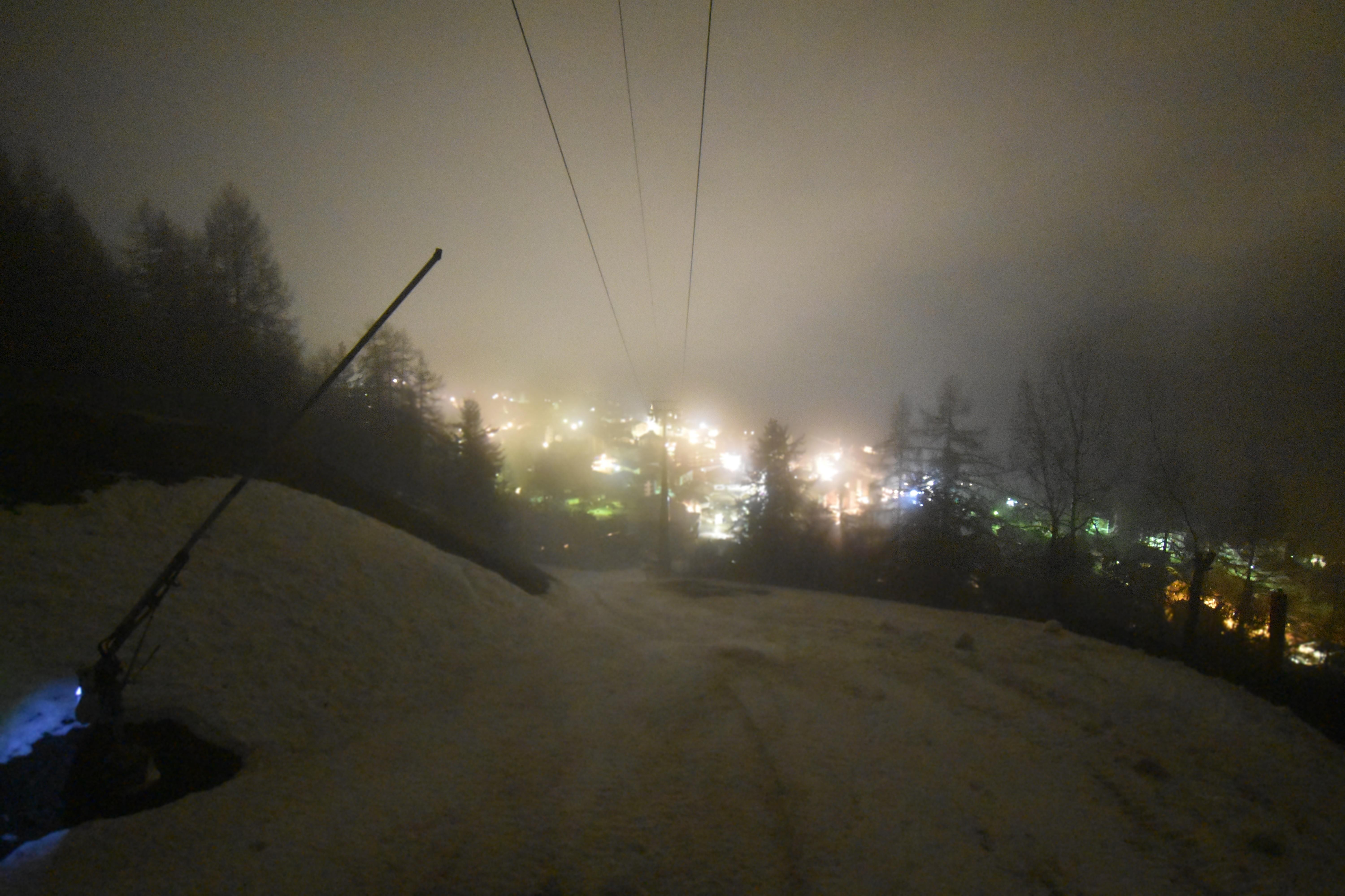 Blick von der Talabfahrt des Skigebiets auf das Dorf Grächen und die Talstation der Bergbahn.