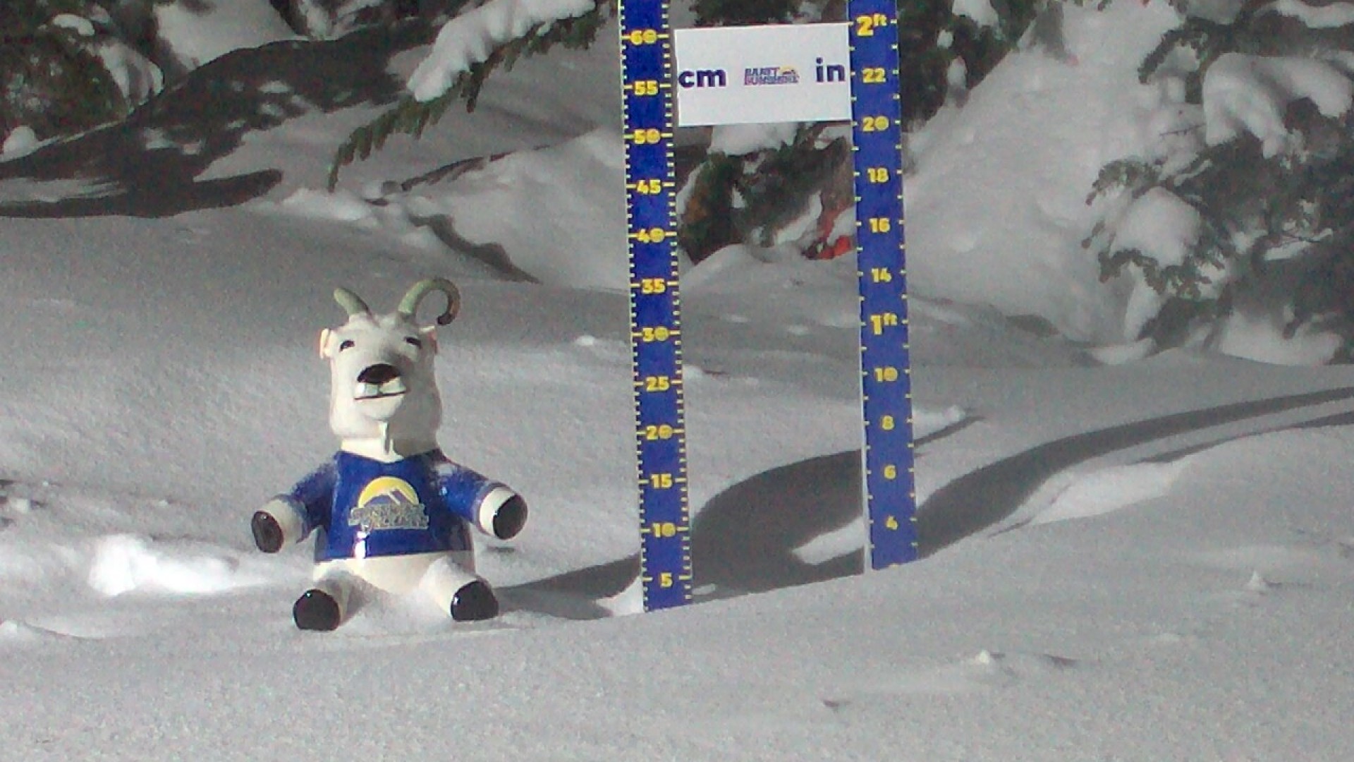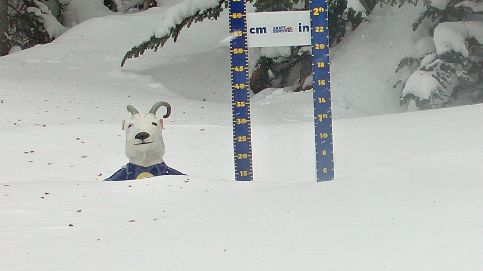 Die Webcam zeigt den aktuell gemessenen Neuschnee im Skigebiet Sunshine Village.
