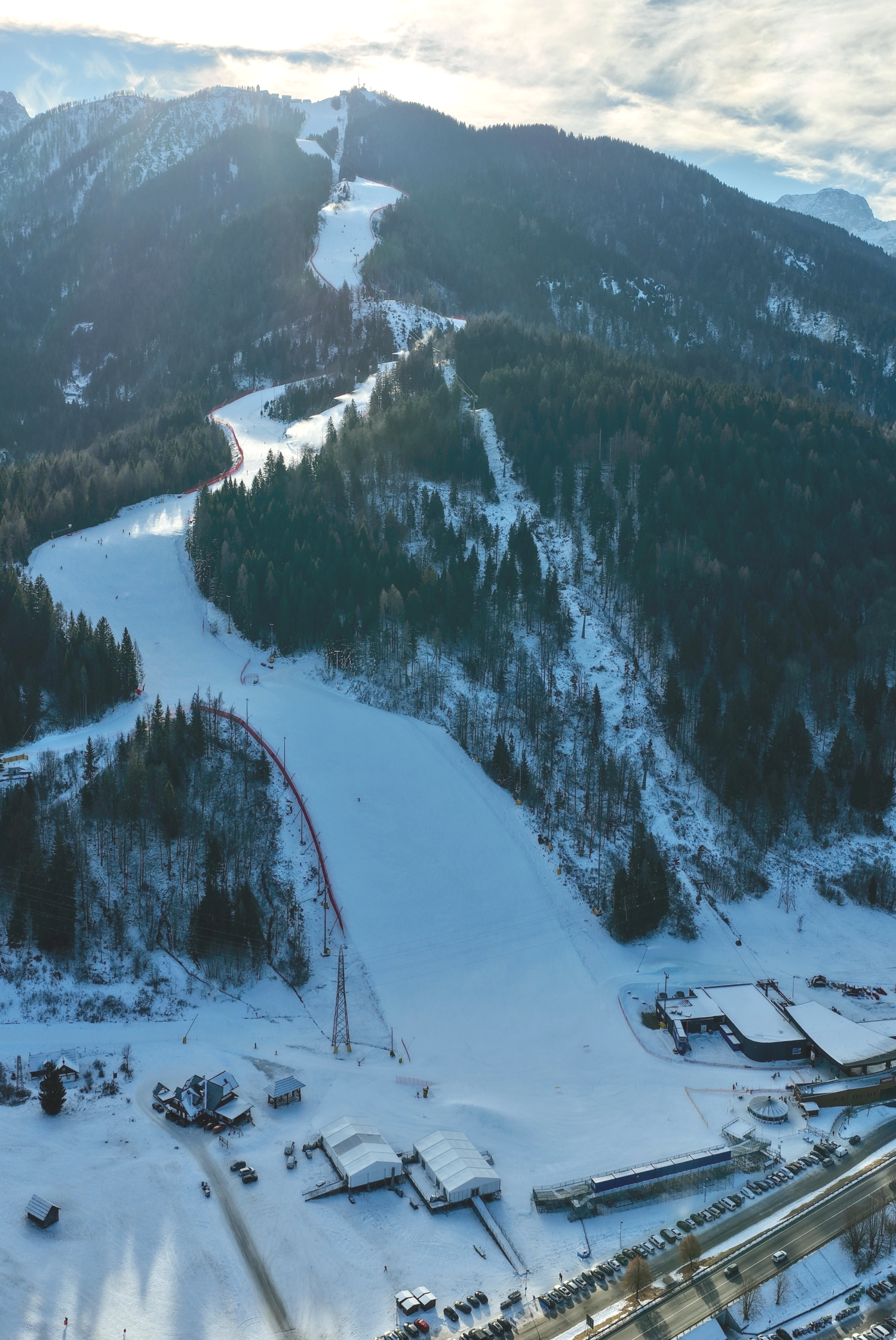 Die Kulisse ist beeindruckend: Im Hintergrund ragen die markanten Felswände des Canin auf, während der Luschari mit seiner Flutlichtanlage über dem Ort thront. Hier haben schon Weltmeister trainiert, und noch heute spürst du an jeder Kurve die sportliche Tradition dieses Ortes – vor allem auf der legendären Pista di Prampero, wo regelmäßig Weltcup-Rennen stattfinden.