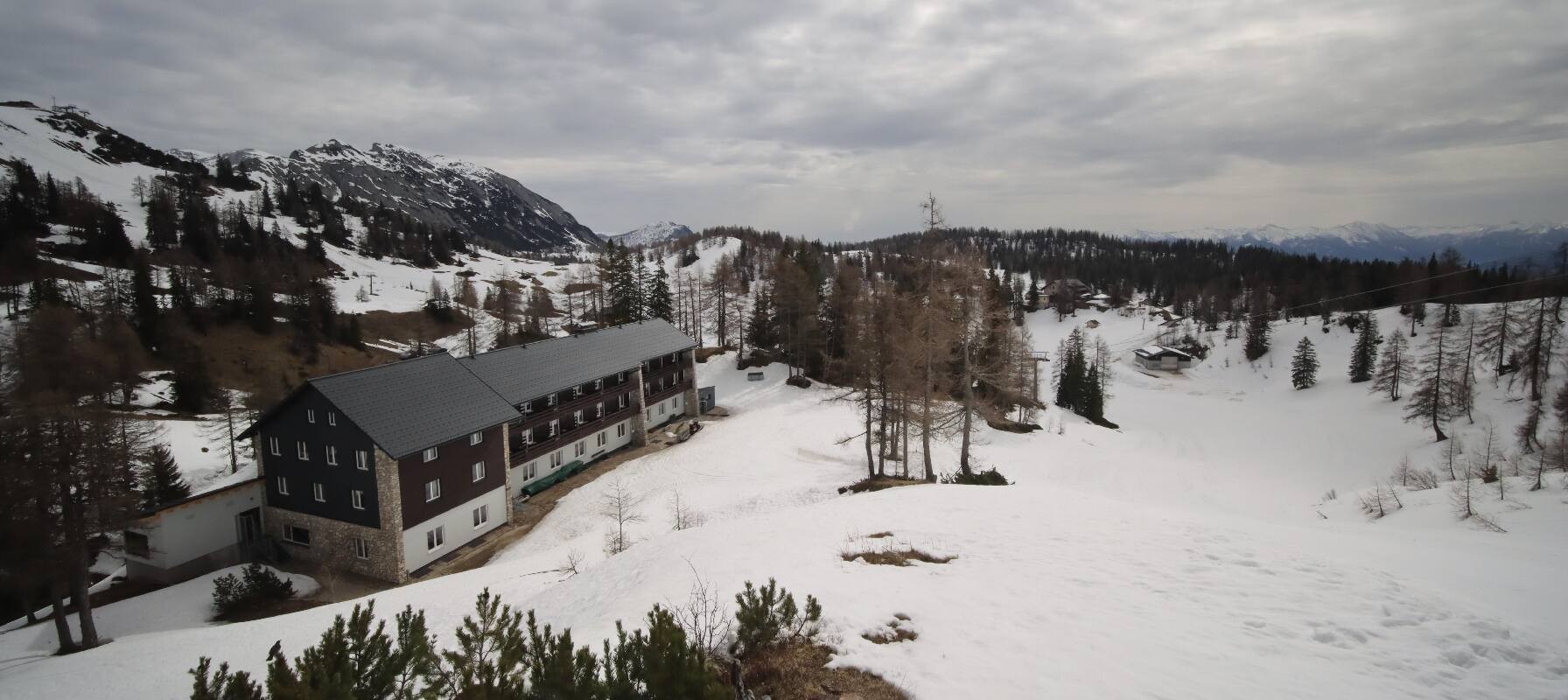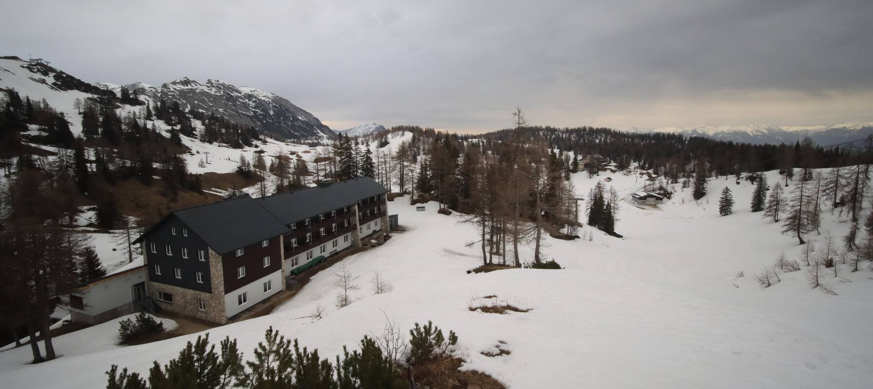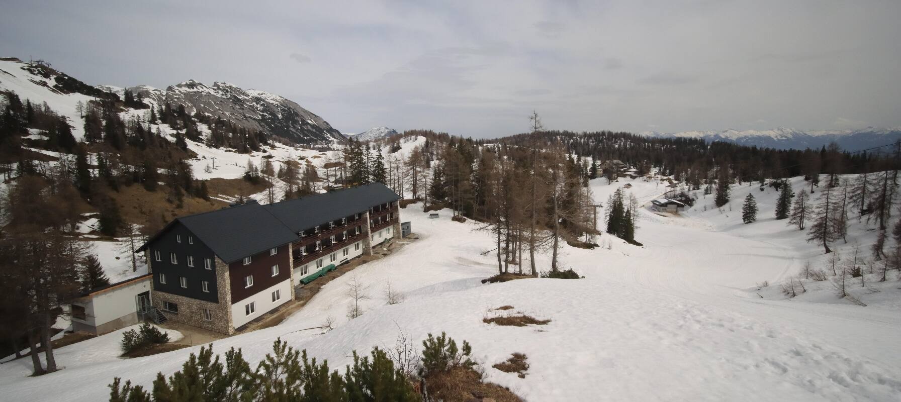 Die Kamera zeigt das Haus Alpin am Lawinensteinlift im Skigebiet Tauplitz. Im Hintergrund ist auch das Hollhaus zu sehen.