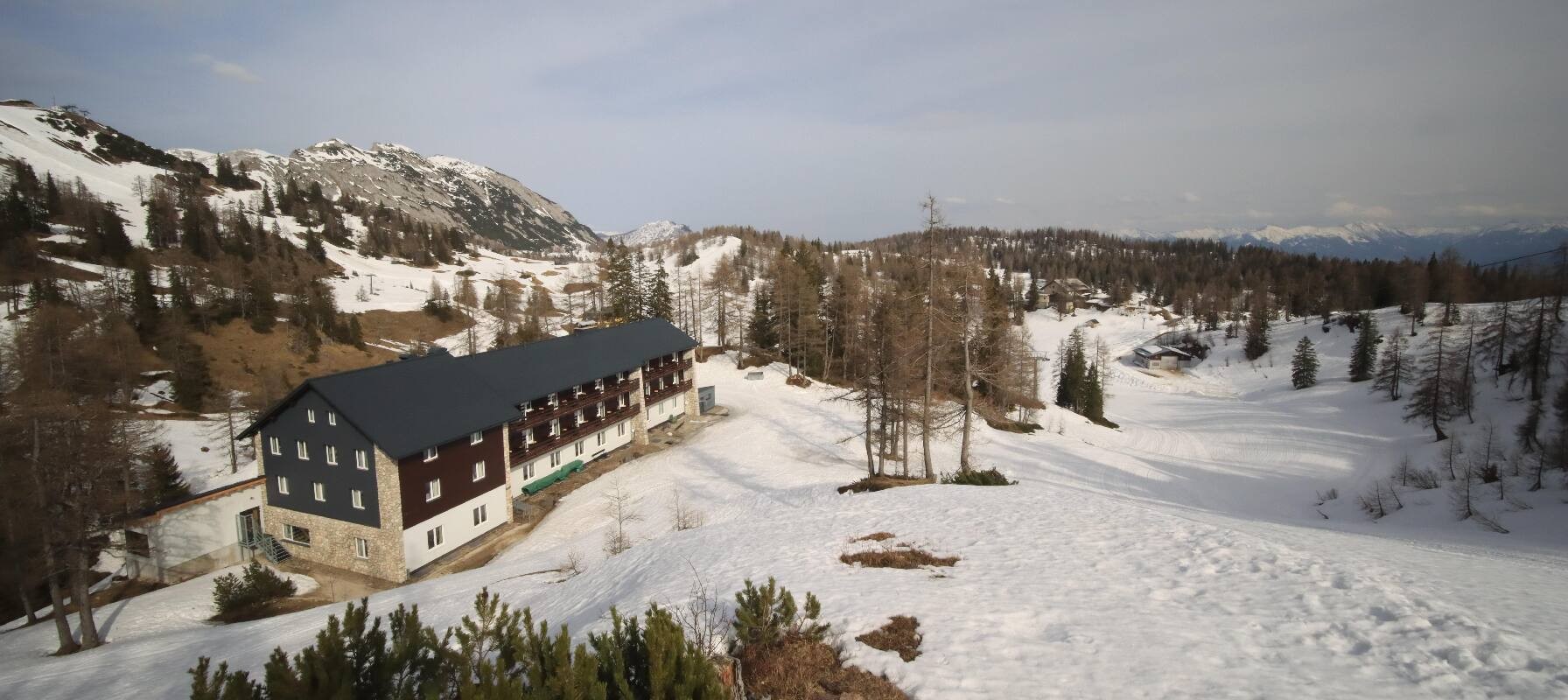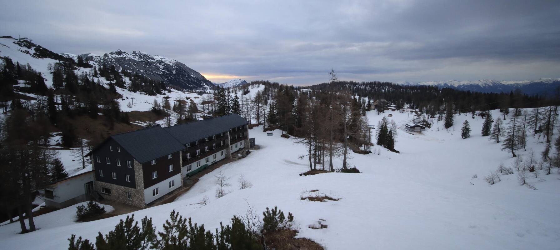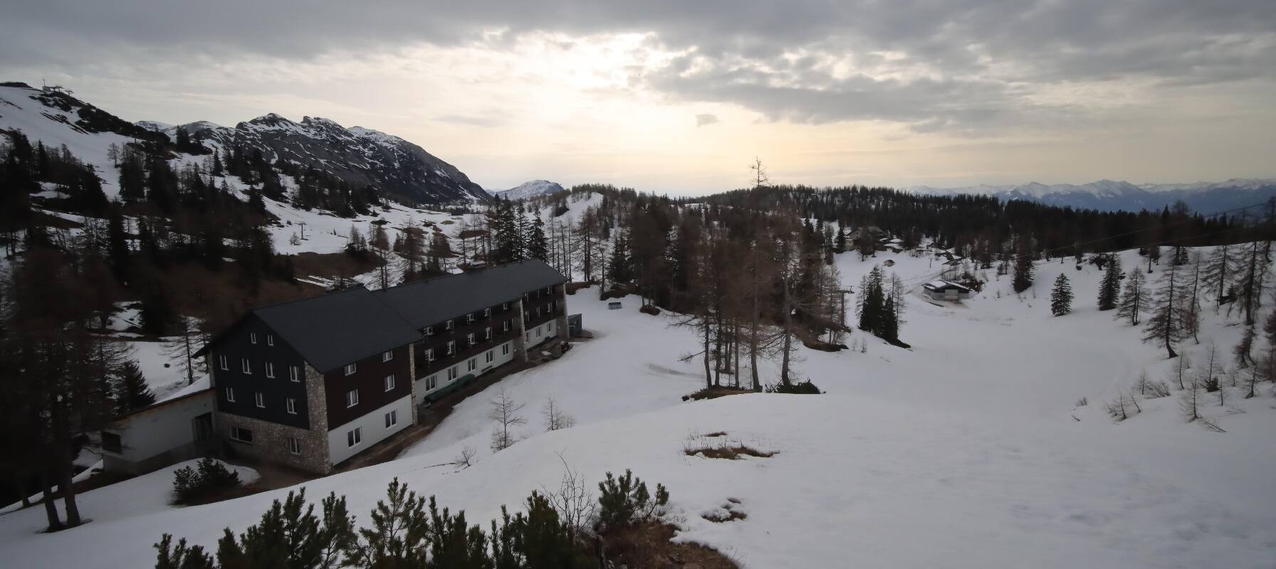 Die Kamera zeigt das Haus Alpin am Lawinensteinlift im Skigebiet Tauplitz. Im Hintergrund ist auch das Hollhaus zu sehen.
