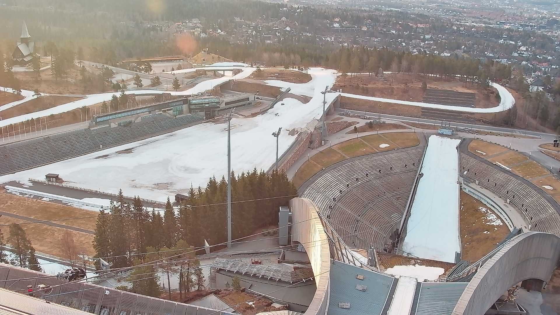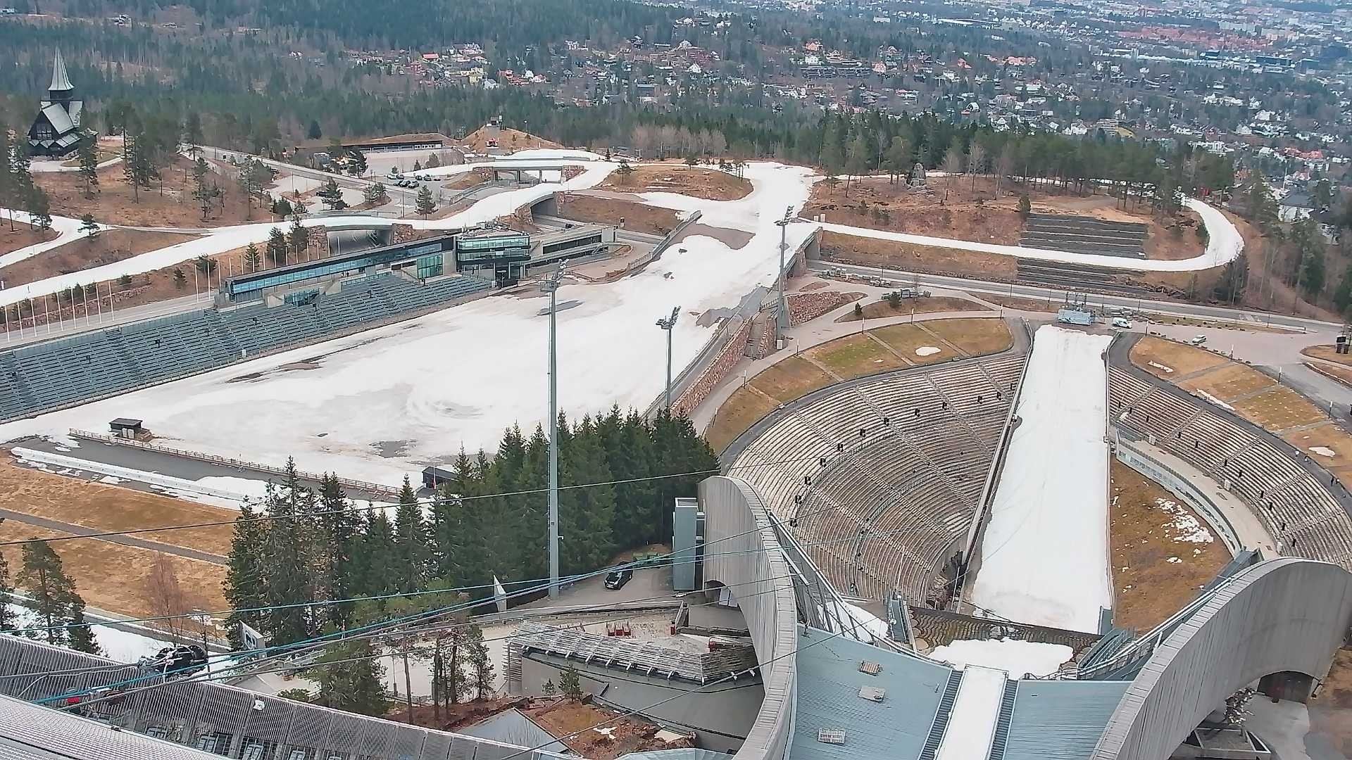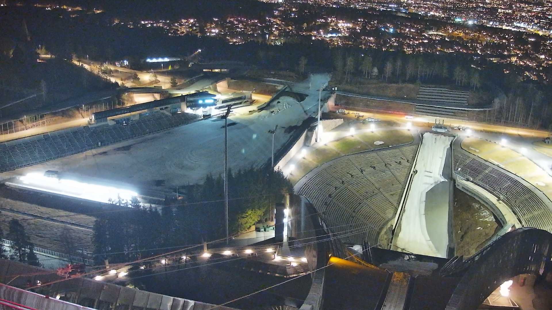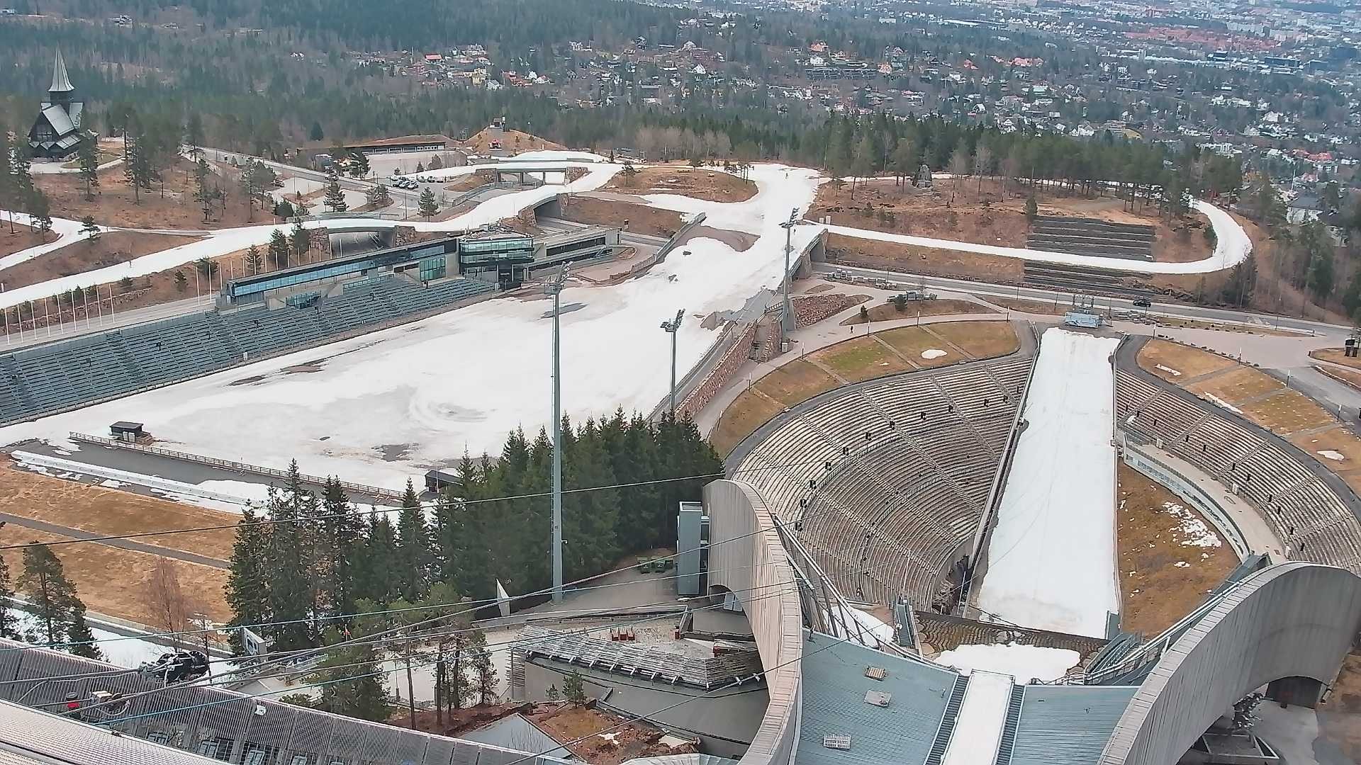 Blick von der Skisprungschanze am Holmenkollen in Oslo. Neben der Schanze sieht man links das Langlauf- und Biathlonstadion, wo auch viele Weltcuprennen stattfinden. Während der Weltcupveranstaltungen kann es aus rechtlichen Gründen zu Übertragungspausen kommen.