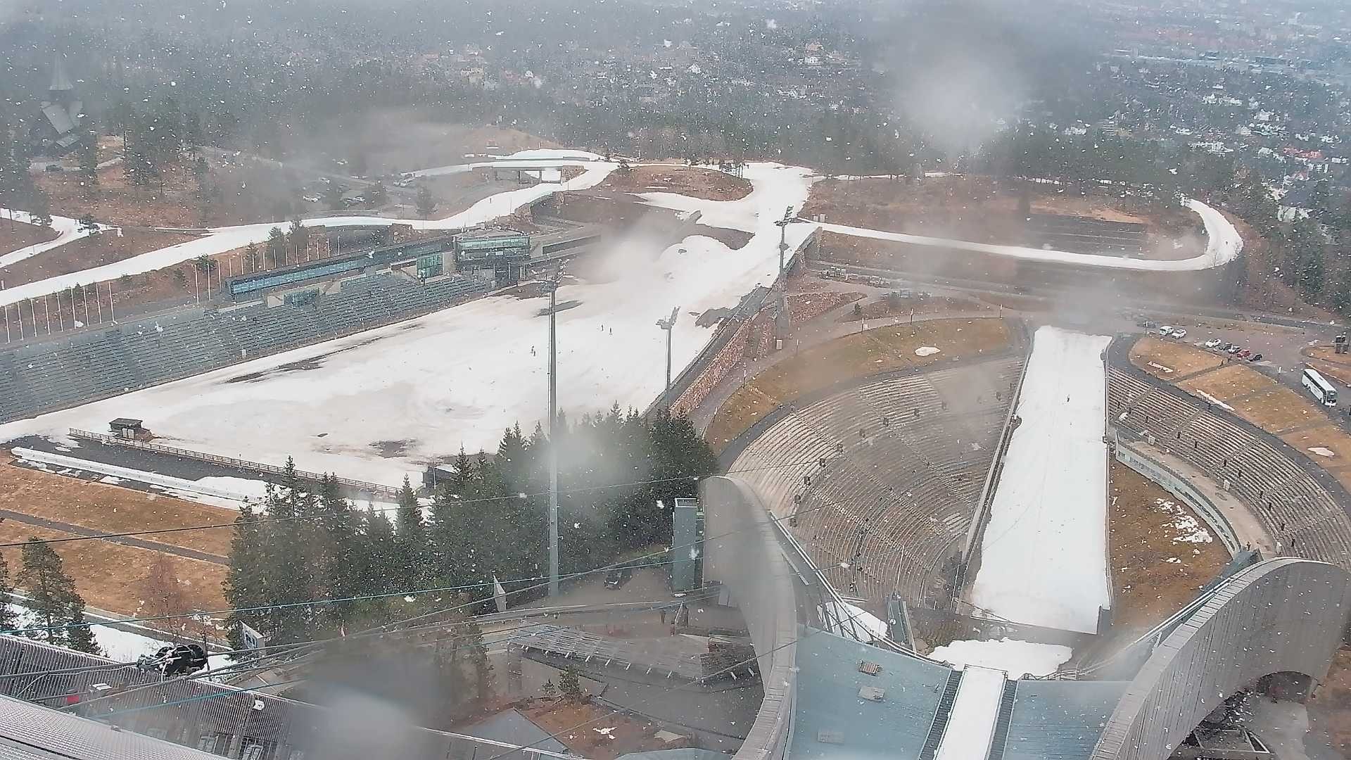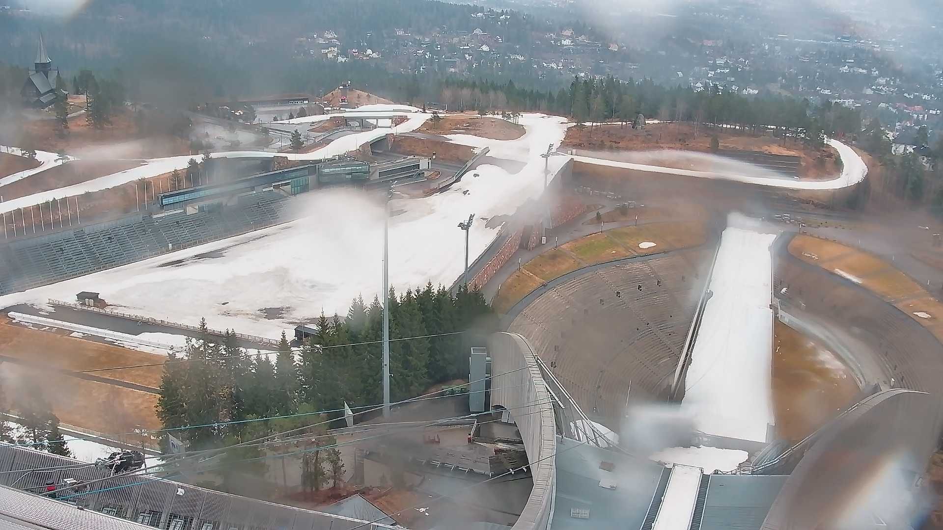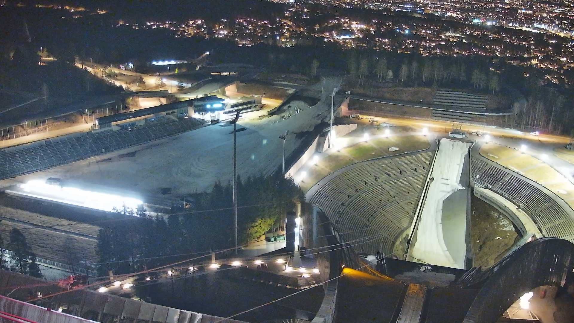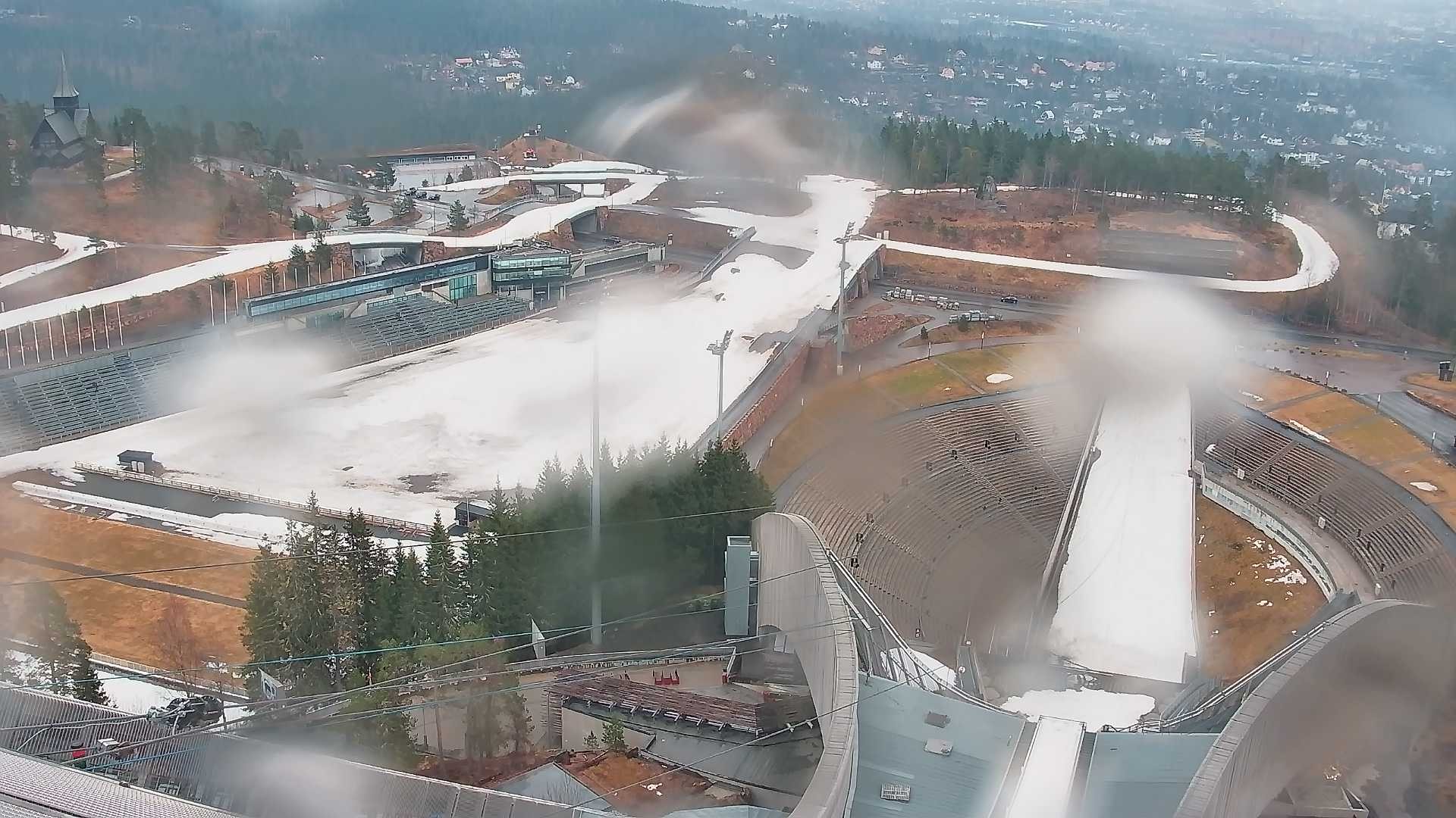 Blick von der Skisprungschanze am Holmenkollen in Oslo. Neben der Schanze sieht man links das Langlauf- und Biathlonstadion, wo auch viele Weltcuprennen stattfinden. Während der Weltcupveranstaltungen kann es aus rechtlichen Gründen zu Übertragungspausen kommen.