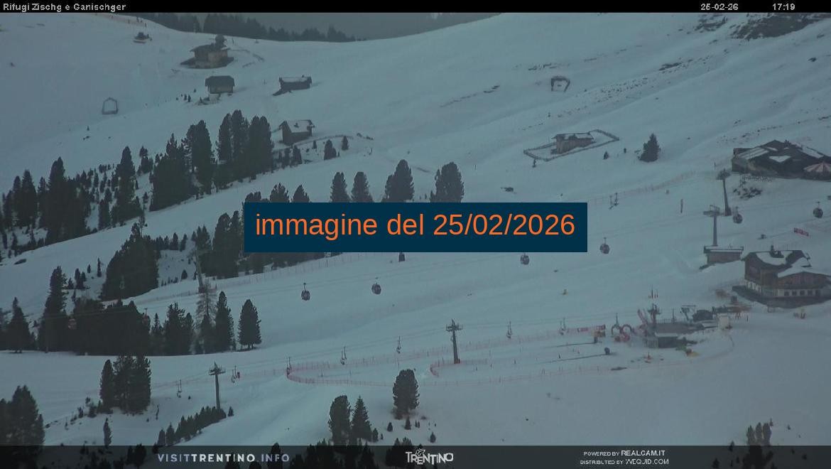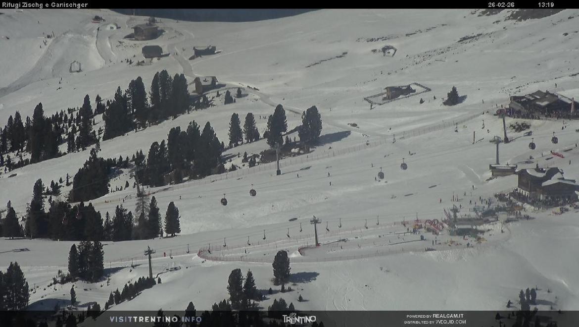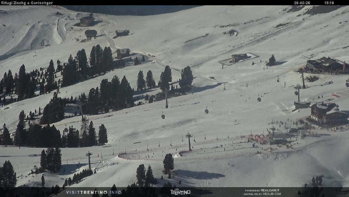 Archived webcam image showing Val di Fiemme, Rifugi Zisch and Genischer on Feb 26, 2026 at 12:30 PM 06:00