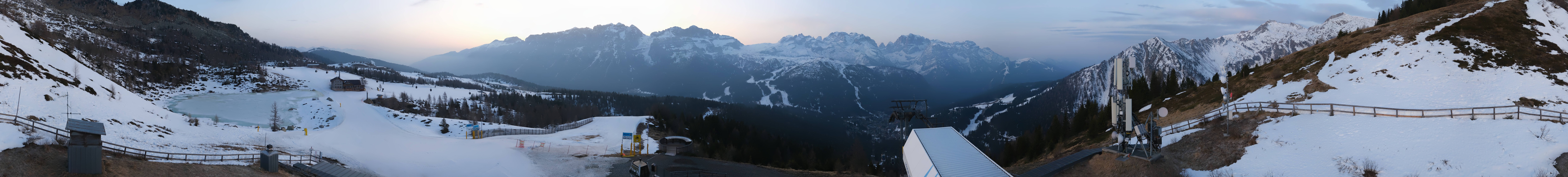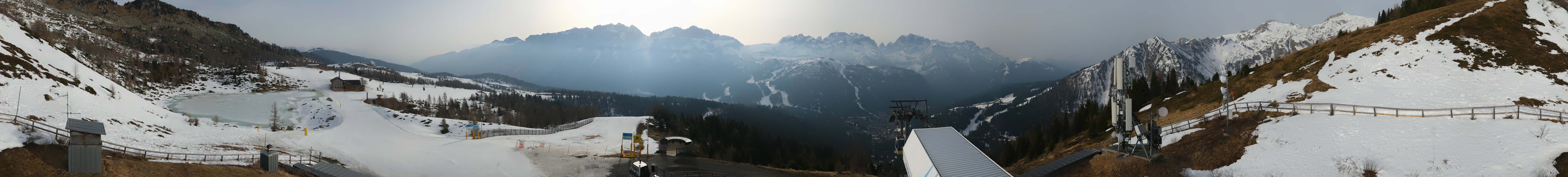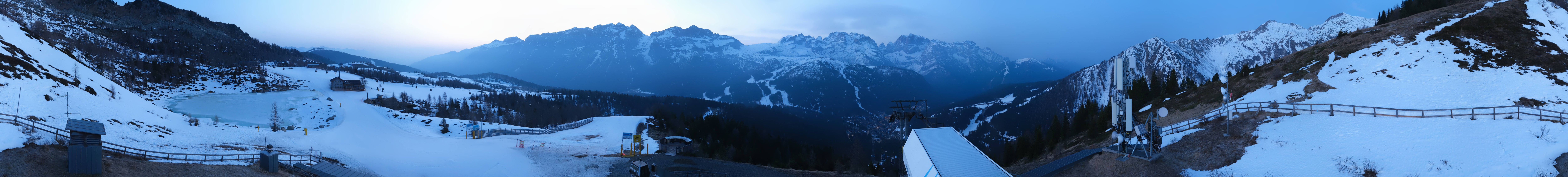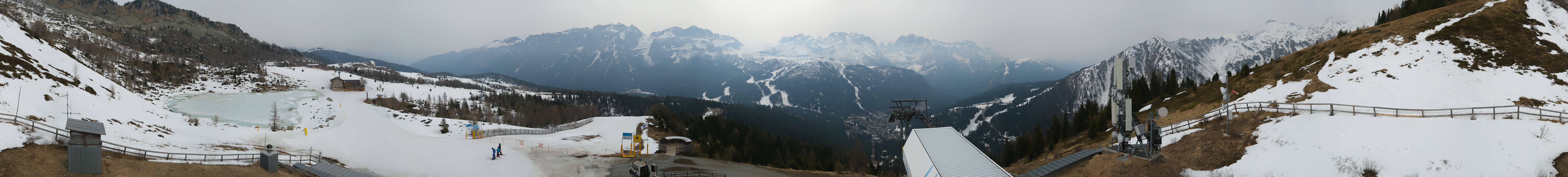 Ausblick von der Bergstation der Gondelbahn Pradalago Express im Skigebiet Madonna di Campiglio. Hier starten die blaue Piste Pradalago Facile und die schwarze Abfahrt Amazzonia. Im Hintergrund siehst du die Sessellifte Fortini Express und Zeledria Express sowie das Rifugio Viviani.