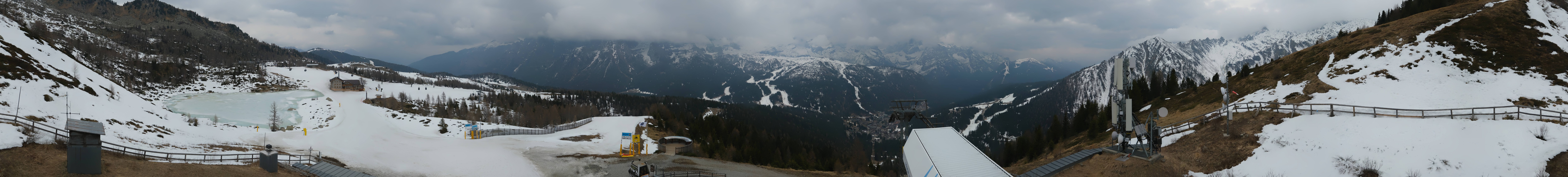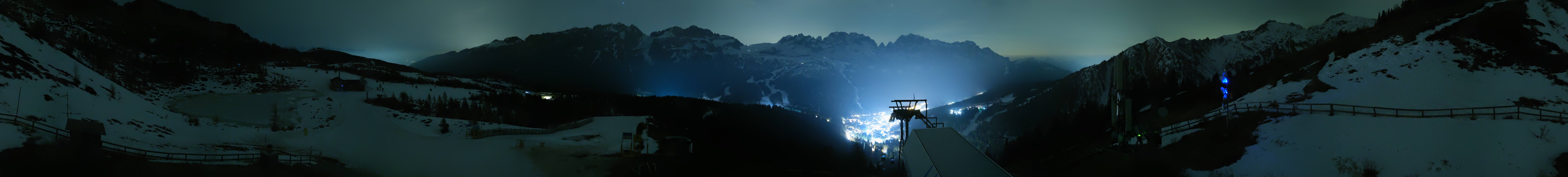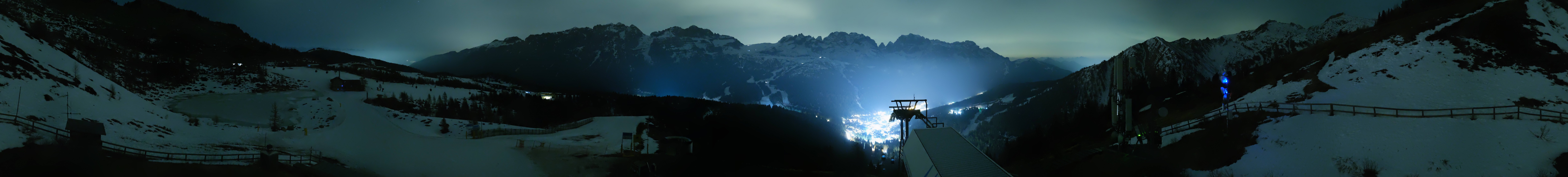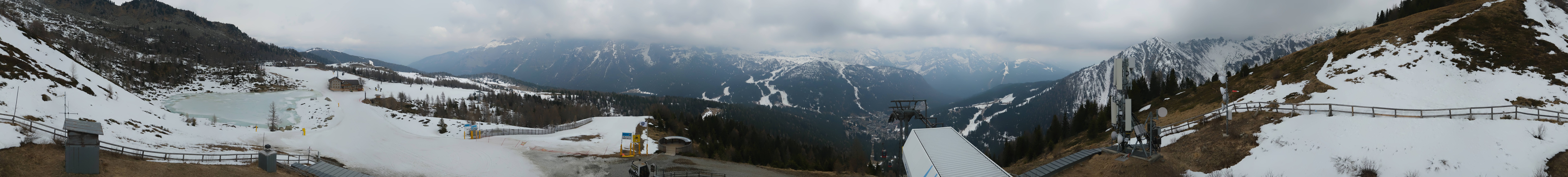 Ausblick von der Bergstation der Gondelbahn Pradalago Express im Skigebiet Madonna di Campiglio. Hier starten die blaue Piste Pradalago Facile und die schwarze Abfahrt Amazzonia. Im Hintergrund siehst du die Sessellifte Fortini Express und Zeledria Express sowie das Rifugio Viviani.