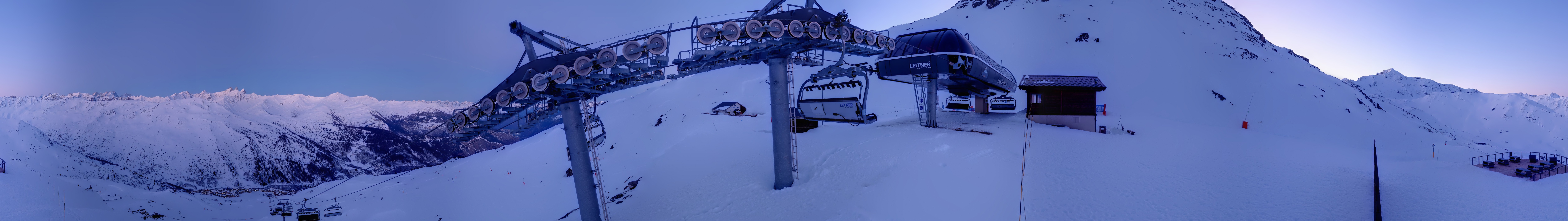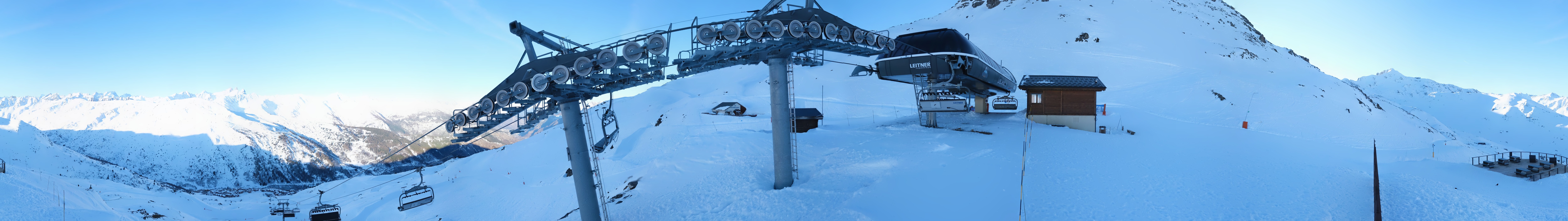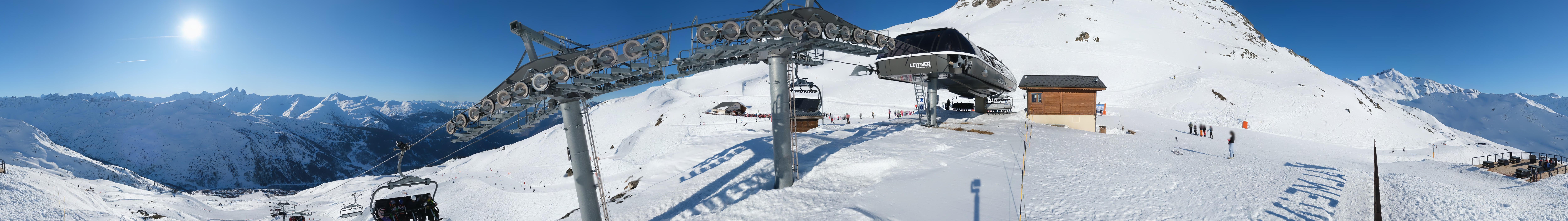 An der Bergstation des Sessellifts Les Jeux auf über 1800 Metern steht diese 360-Grad-Panoramakamera mit einem herrlichen Blick über die französischen Alpen nahe der französisch-italienischen Grenze in der Region Savoyen