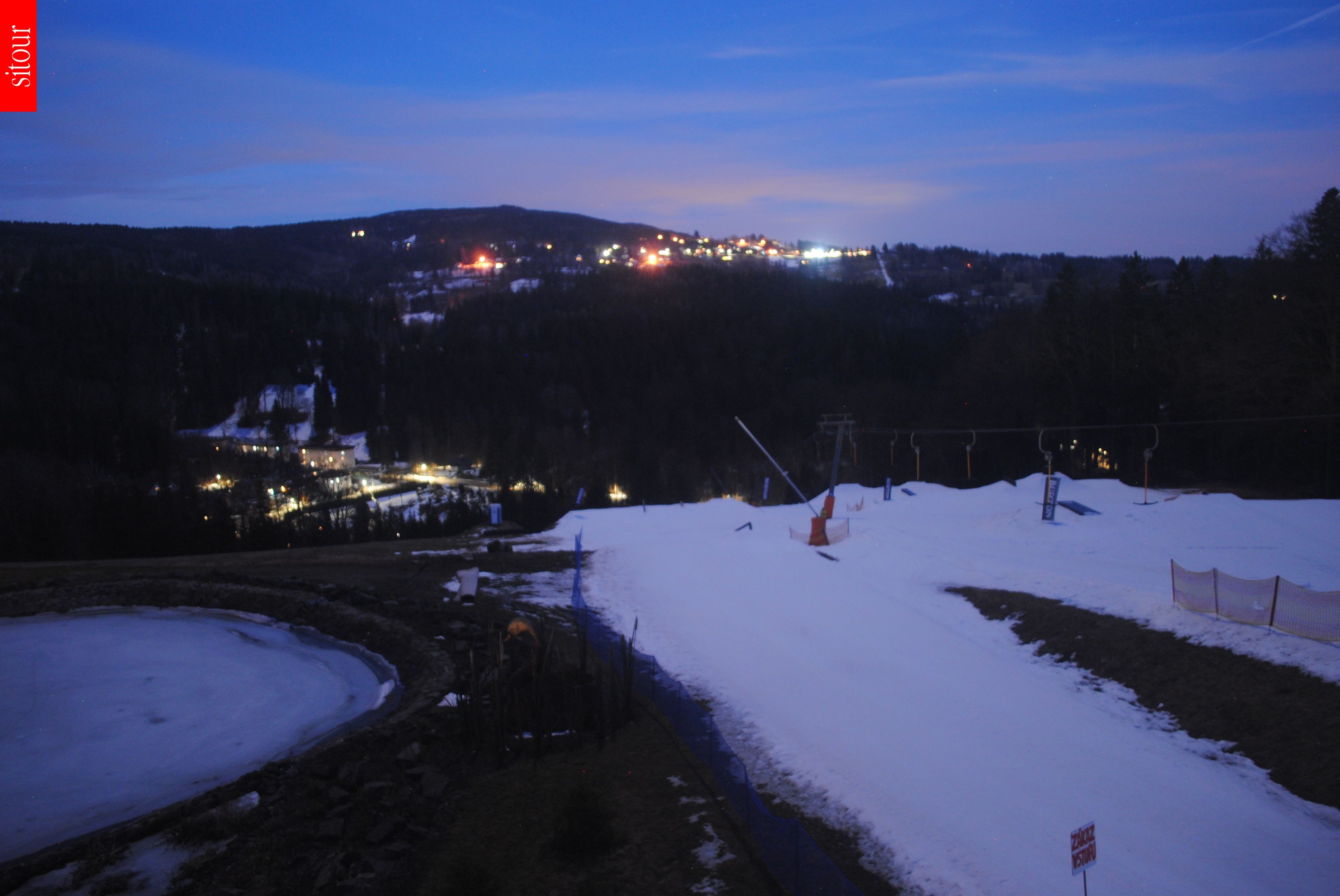 Die Kamera befindet sich an der Bergstation des Jizerka-Schlepplifts und blickt auf den Funpark des Skigebiets Vítkovice Aldrov.