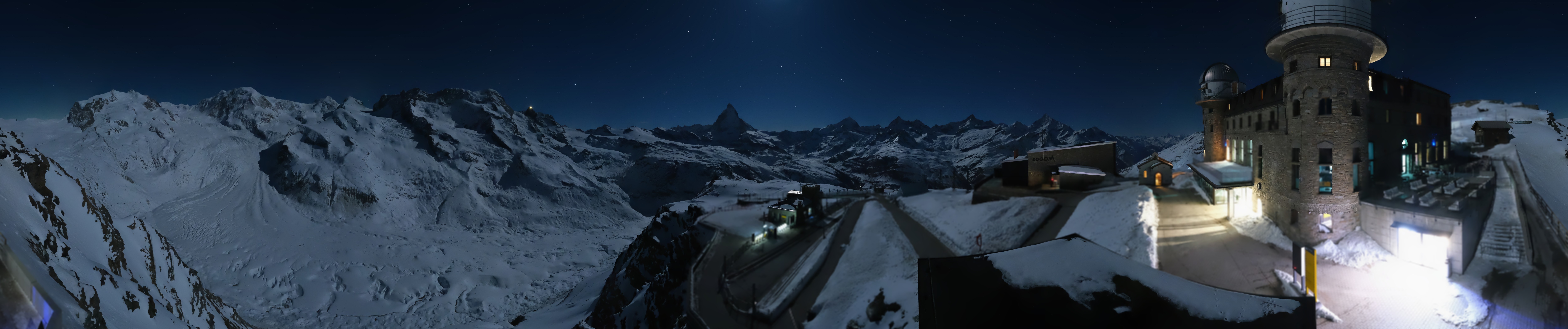 Die Webcam zeigt das Panorama von der Bergstation der Gornergratbahn. Zu sehen ist außerdem das Gornergrat Kulm Hotel auf 3.100 Meter Höhe. Das traumhafte Panorama zeigt neben dem Matterhorn auch das Breithorn und weitere 4.000er.