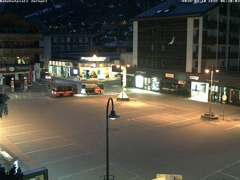 Archiviertes Webcam Bild: Zermatt: Bahnhofplatz am 10.04.2026 um 04:55 Uhr 04:00