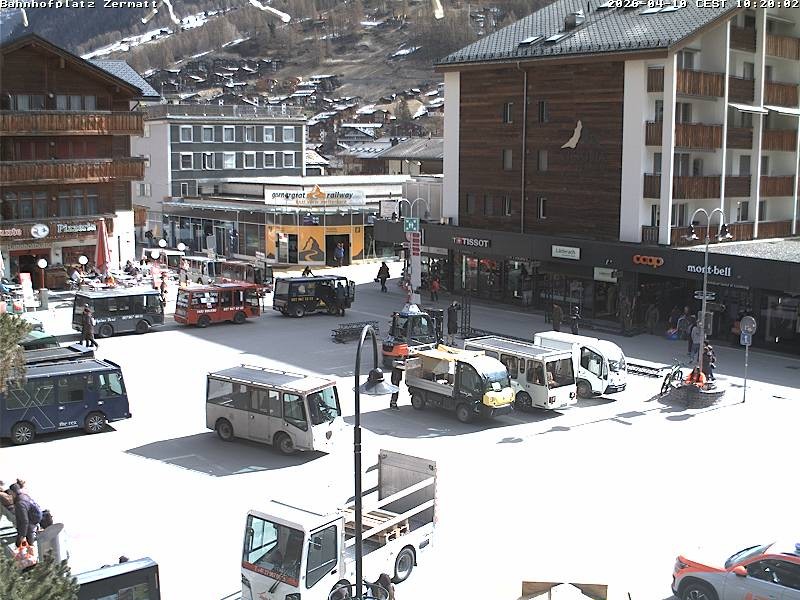 Archiviertes Webcam Bild: Zermatt: Bahnhofplatz am 10.04.2026 um 10:55 Uhr Aktuell