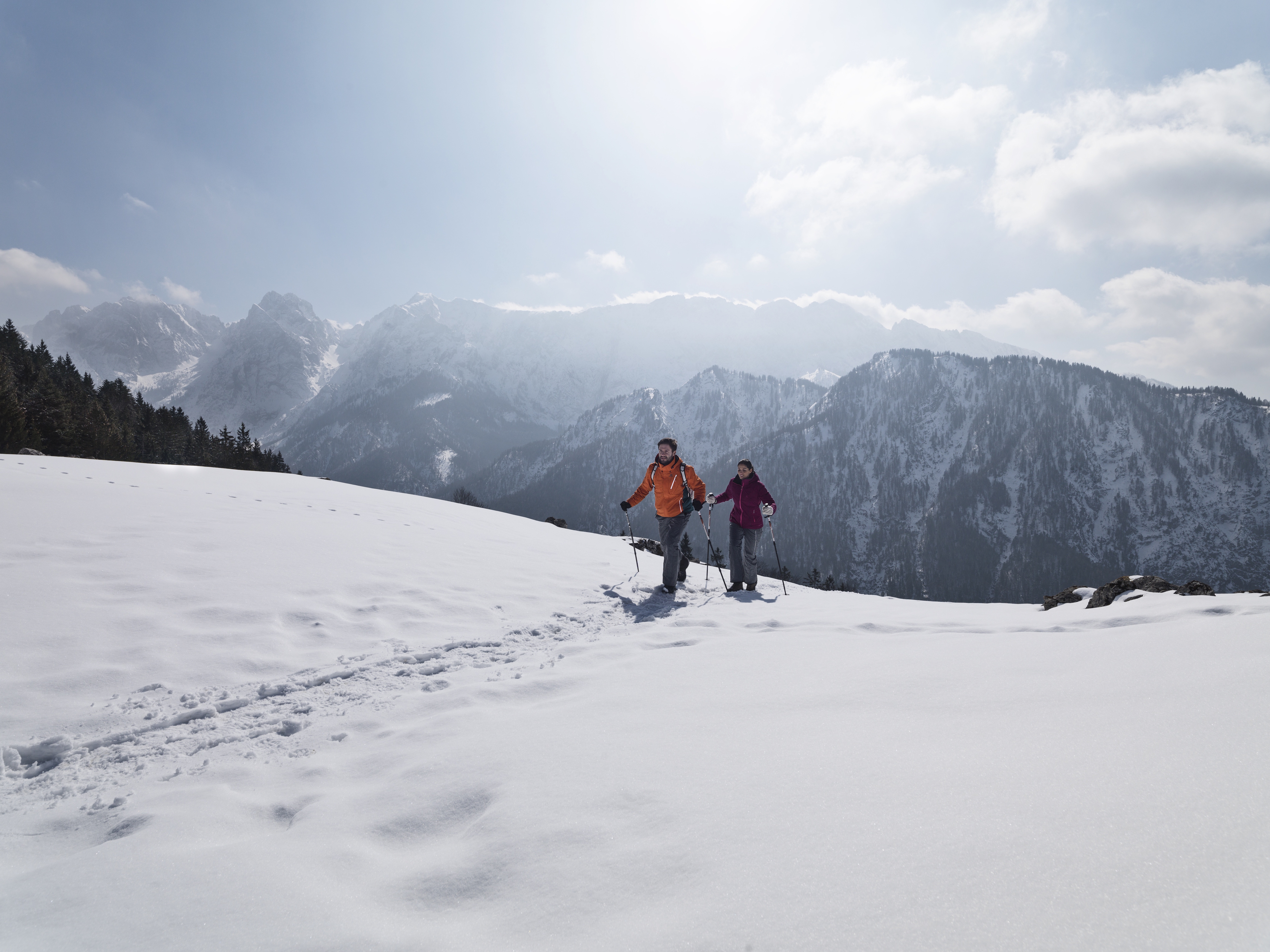 Das Seefelder Plateau ist ideal zum Winterwandern. Mit seiner Lage auf über 1.200 Metern ist es schneesicher, bietet aber dennoch eine recht zahme Topografie. Der perfekte Ort also für Tirols ersten Winter-Weitwanderweg. Auf vier Tagesetappen geht es durch die winterliche Olympiaregion. Dabei läufst du auf geräumten Wegen von Leutasch ins Leutaschtal, weiter ins Wildmoos und zur Friedensglocke in Mösern. Ziel der Tour ist die Wettersteinhütte, die auf 1.717 Metern liegt. Auf Wunsch wird das Gepäck von Unterkunft zu Unterkunft transportiert. Du kannst also ganz unbeschwert und ohne großen Rucksack die verschneite Landschaft genießen.