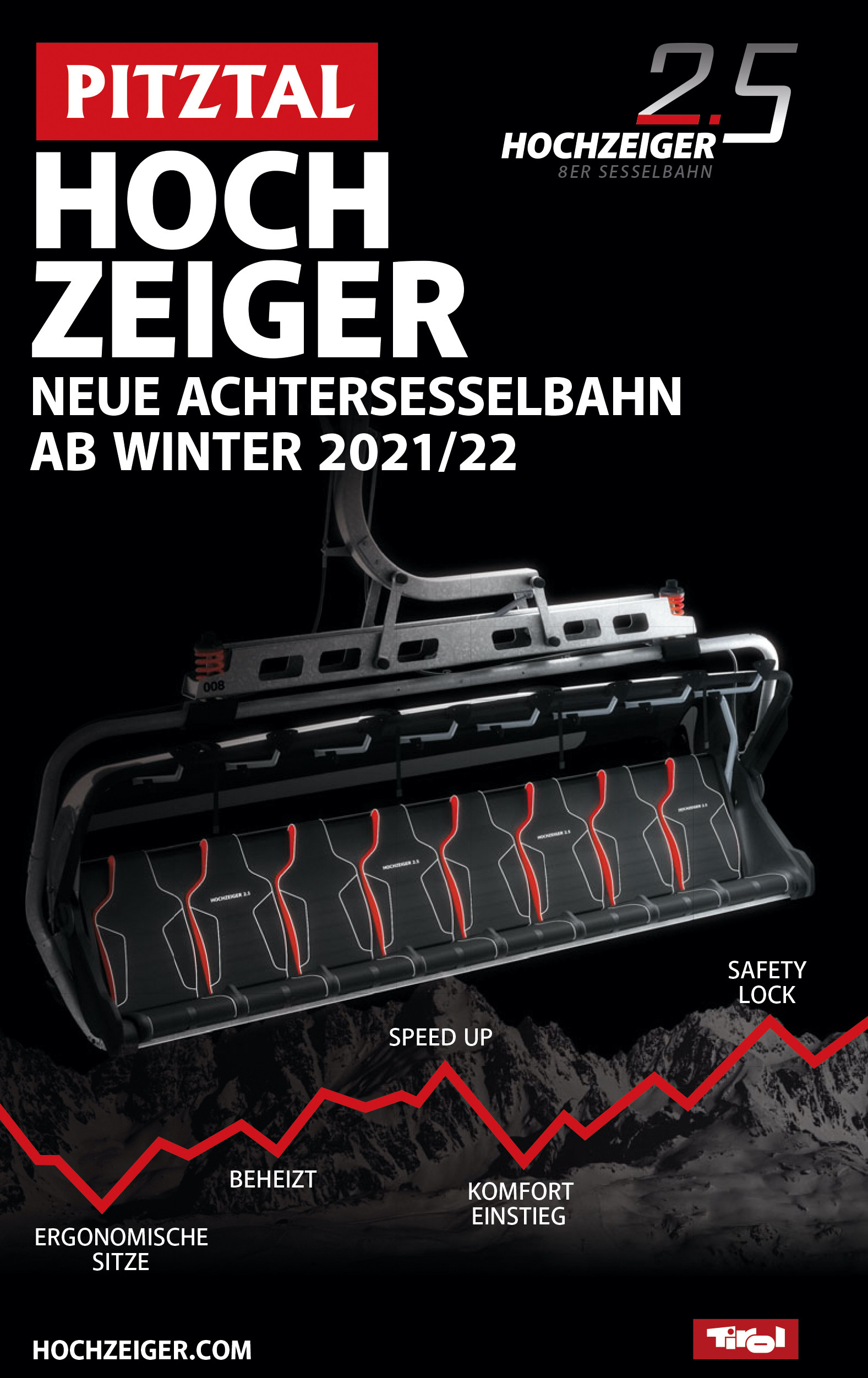 Am Hochzeiger im Pitztal entsteht eine moderne 8er-Sesselbahn. Die neue Bahn „Hochzeiger 2.5“ ersetzt ab der kommenden Wintersaison 2021/2022 die alte 4er-Sesselbahn Rotmoosbahn. Die neuen Sessel sind mit Wetterschutzhauben, beheizten Komfortsitzen und verriegelten Schließbügeln ausgestattet und bieten den Fahrgästen somit deutlich mehr Komfort als auch Sicherheit. Darüber hinaus verkürzt sich die Fahrzeit auf nur noch 4:46 Minuten.