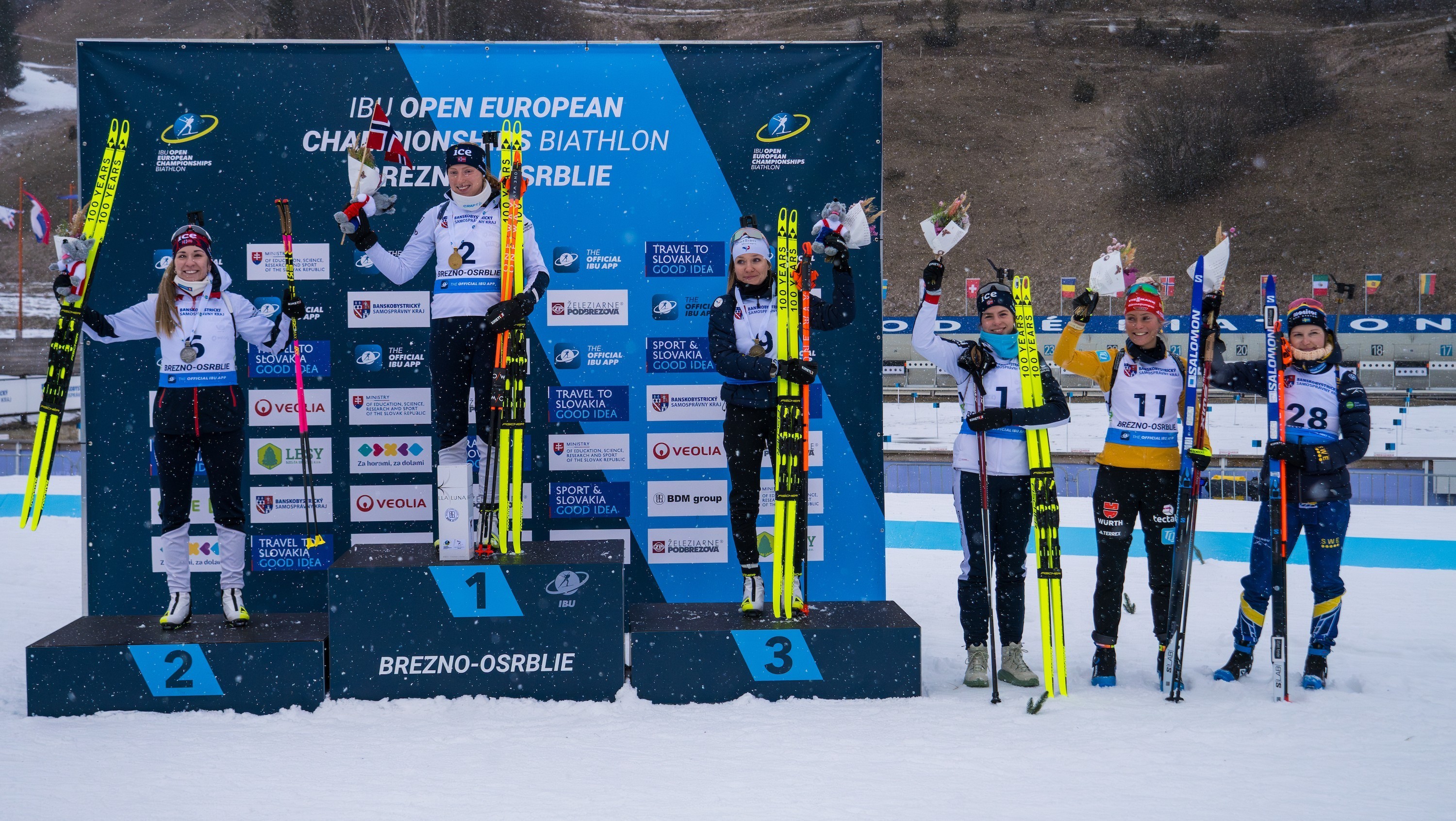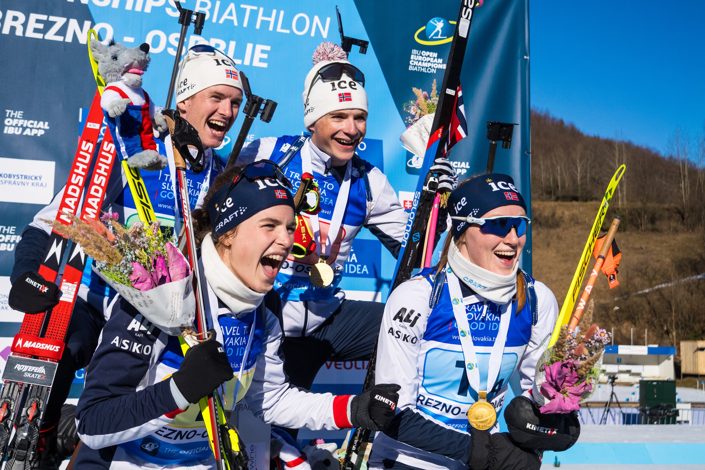 Nach ihren vielen Einzelerfolgen bei dieser EM hat das norwegische Team auch in der 4er Mixedstaffel am Sonntagvormittag aufgetrumpft. Isak Frey, Johan Botn, Ida Lien und Maren Kirkeeide gewannen das Rennen vor den Teams aus Frankreich und Italien. Das deutsche Team mit Lucas Fratzscher, David Zobel, Stefanie Scherer und Marion Wiesensarter landete auf dem fünften Platz.