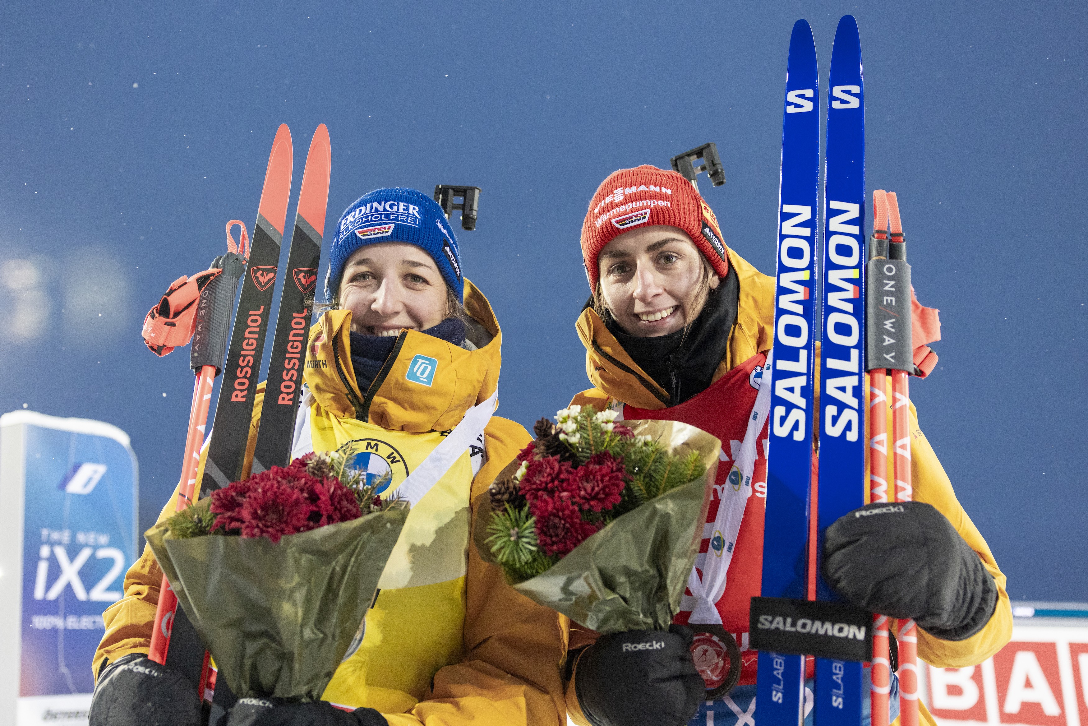 Die guten deutschen Ergebnisse in Östersund gehen auch am Sonntag weiter: Franziska Preuß und Vanessa Voigt holen sich mit den Plätzen 2 und 3 gleich zwei Podestplätze in der Verfolgung. Preuß kämpfte auf der Schlussrunde sogar mit um den Sieg. Allerdings musste sie sich auf der Zielgerade der französischen Sprintsiegerin Lou Jeanmonnot um 0,3 Sekunden knapp geschlagen geben. Preuß wird nun als Führende im Gesamtweltcup weiter nach Hochfilzen reisen (Programm Hochfilzen).