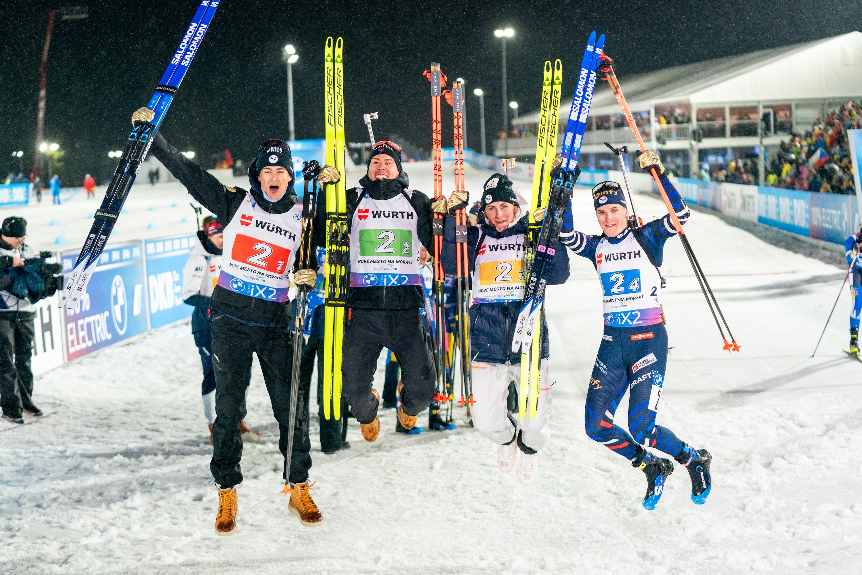 Freudensprünge beim französischen Team nach Gold in der Mixed-Staffel.