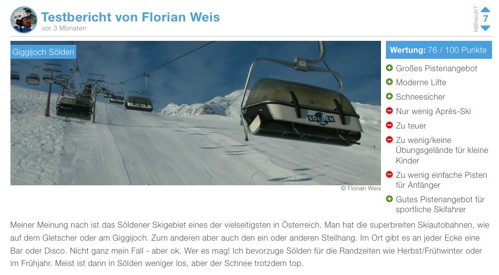 Abgesehen von den Testberichten (siehe Teil 3) könnt ihr ein Skigebiet auch allgemein bewerten. Hier gibt es bis zu fünf Sterne zu vergeben. Das allgemeine Urteil der User könnt ihr immer am Anfang der Seite sehen. Außerdem beruht auf diesen Wertungen die Hitliste der beliebtesten Skigebiete auf unserer Startseite. Auch bei den Testberichten dürft ihr euer Urteil abgeben. Wie hilfreich war der Bericht? Mit Pfeil nach oben oder unten beeinflusst ihr, an welcher Stelle ein Testbericht erscheint und zeigt damit anderen Nutzern, wie lesenswert der Text ist.