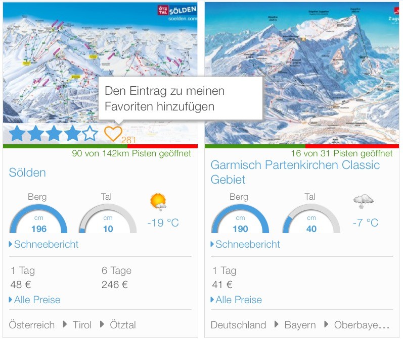 Dank der Favoriten-Funktion hast du deine Lieblingsskigebiete gut im Blick!