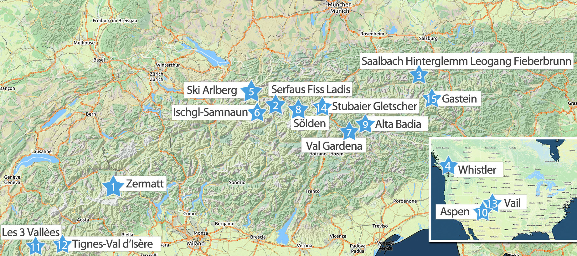 Das sind die Gewinner unseres Rankings der Top 15 Skigebiete der Welt 2020. © Skigebiete-Test
