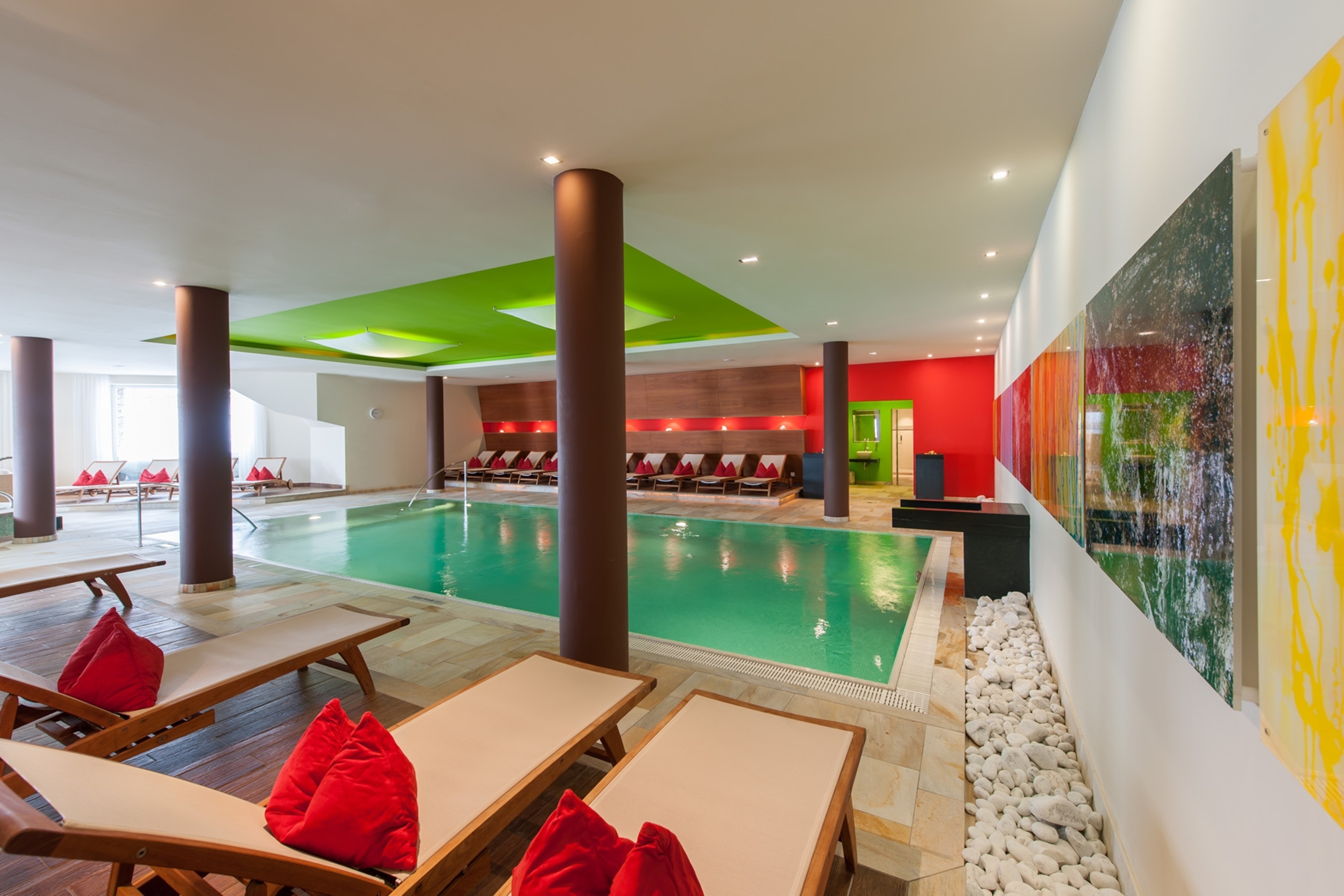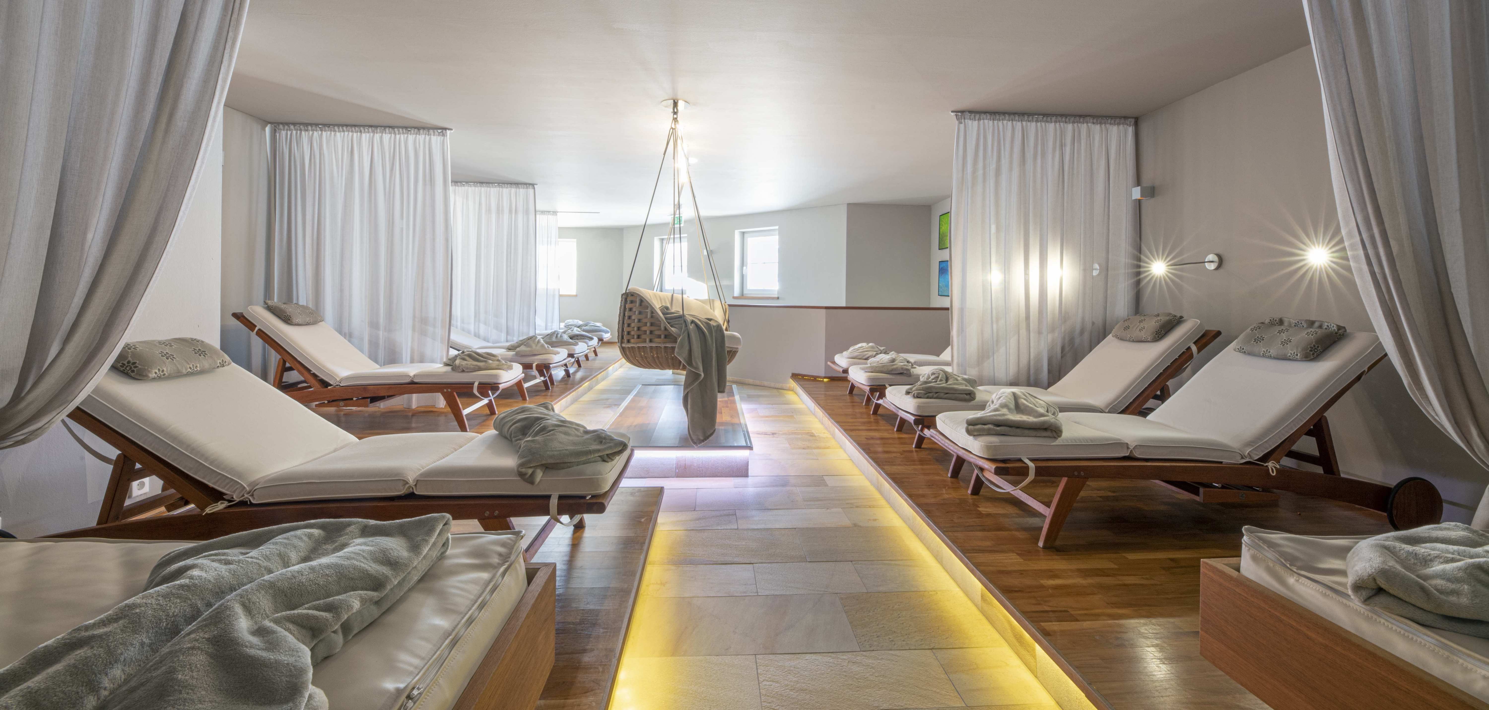 Im großzügigen Wellnessbereich sorgen ein Hallenbad, ein Whirlpool, eine finnische Sauna, eine Dampf- und Solegrotte, eine Altholz-Biosauna, eine Infrarot-Sauna mit Flat-TV und der Relaxbereich mit Wasserbetten für Entspannung. An der Vitalbar stärken sich Gäste bei verschiedenen Säften, Gebirgsquellwasser und gesunden Knabbereien. Zudem bietet die Beautylounge Massagen und Kosmetikbehandlungen an. Wer sich auch bei schlechtem Wetter fit halten oder vor dem Skifahren aufwärmen möchte, trainiert im hoteleigenen Fitnessstudio mit Panorama-Ausblick.