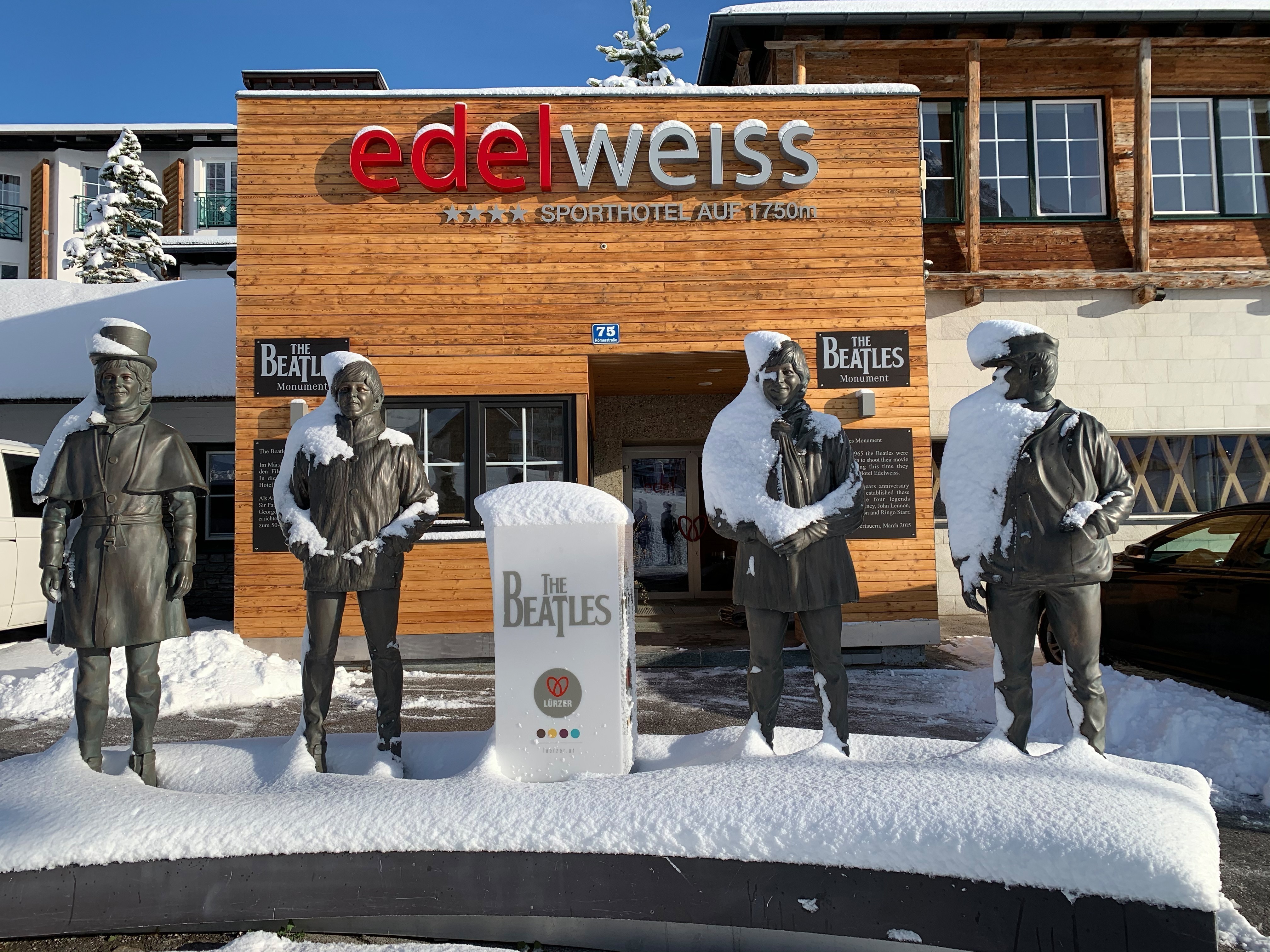 Wer seinen Skiurlaub in Obertauern plant, der sollte sich auf jeden Fall auf viel Schnee einstellen. Denn der Salzburger Skiort liegt auf 1750 Höhenmetern und gilt als extrem schneesicher. Da kann es schon öfters vorkommen, dass die vier lebensgroßen Beatles-Statuen vor dem Eingang des Edelweiss einen weißen Schneemantel bekommen. Gut zu erkennen sind sie trotzdem noch immer und dienen nicht nur als beliebtes Fotomotiv, sondern weisen den Gästen auch den Weg zu einem der besten Familienhotels im Skigebiet.