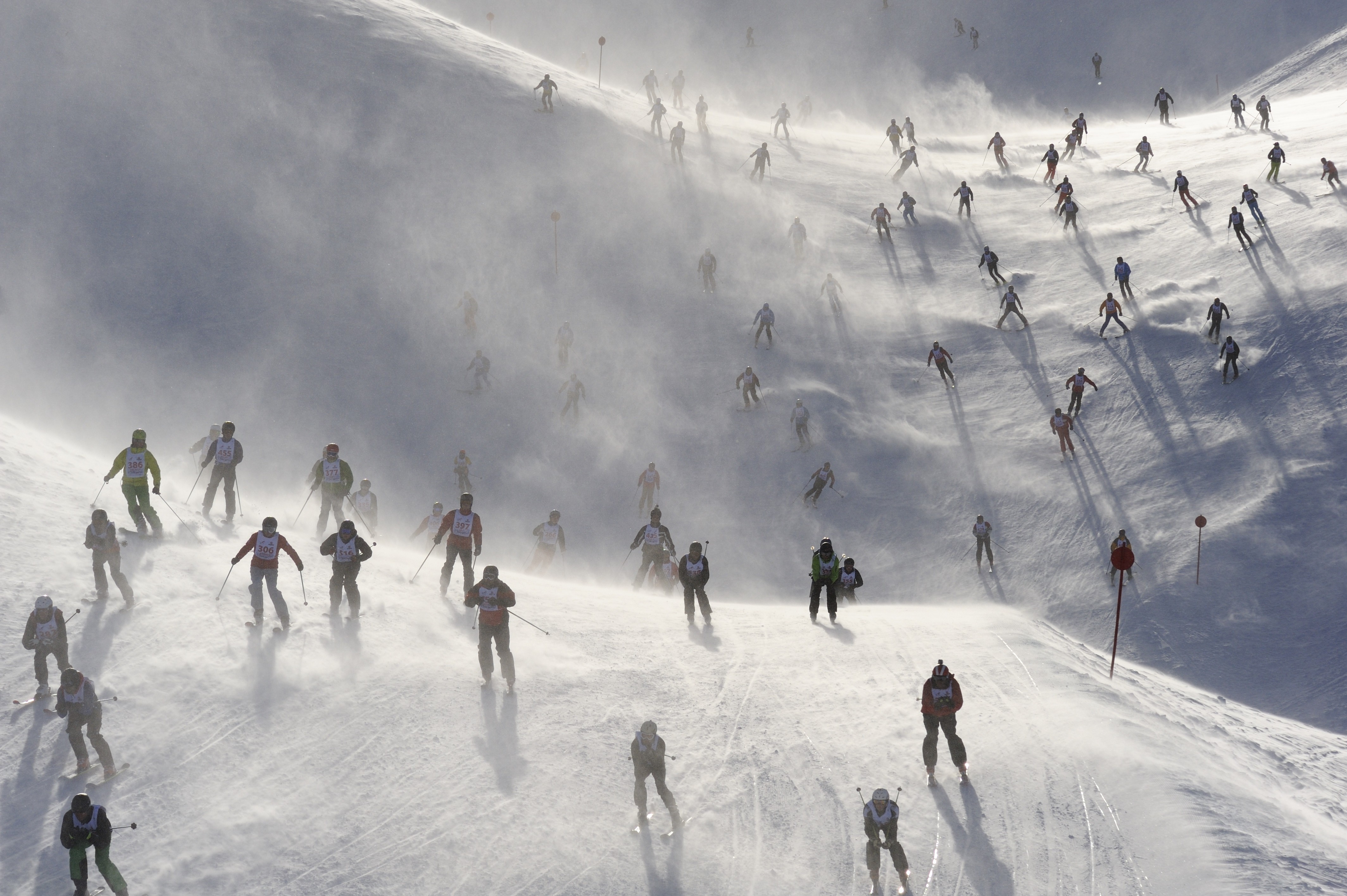 Kilometerlange Glasfaserkabel am Berg, ein Dutzend Kameras und Drohnen sorgen dafür, dass jede Sekunde des Nervenkitzels eingefangen wird, wenn sich 555 Teilnehmer gleichzeitig ins Abenteuer stürzen.