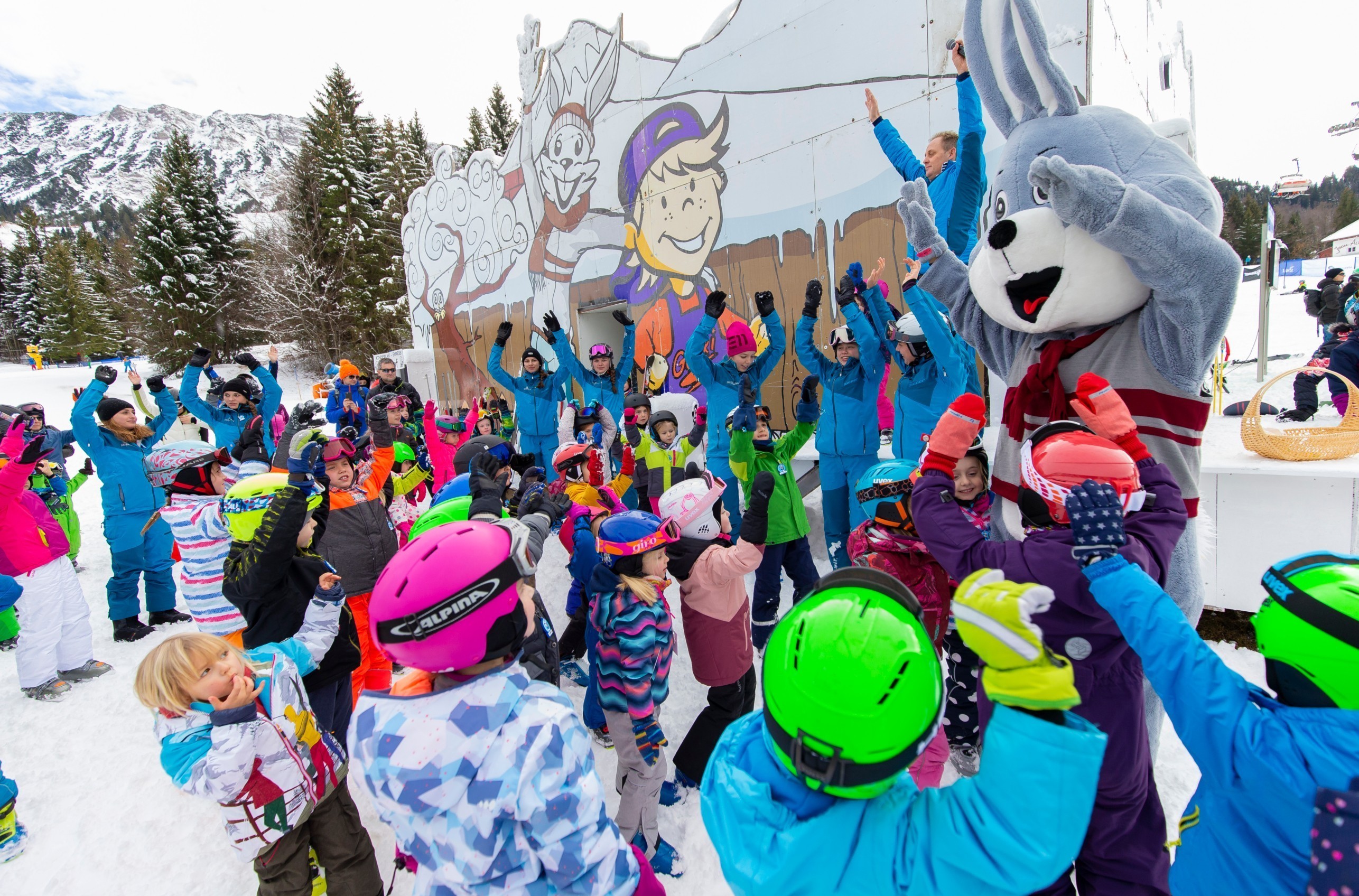 Das Maskottchen ArBär begleitet die Kleinen tatkräftig durch ihren Skitag.