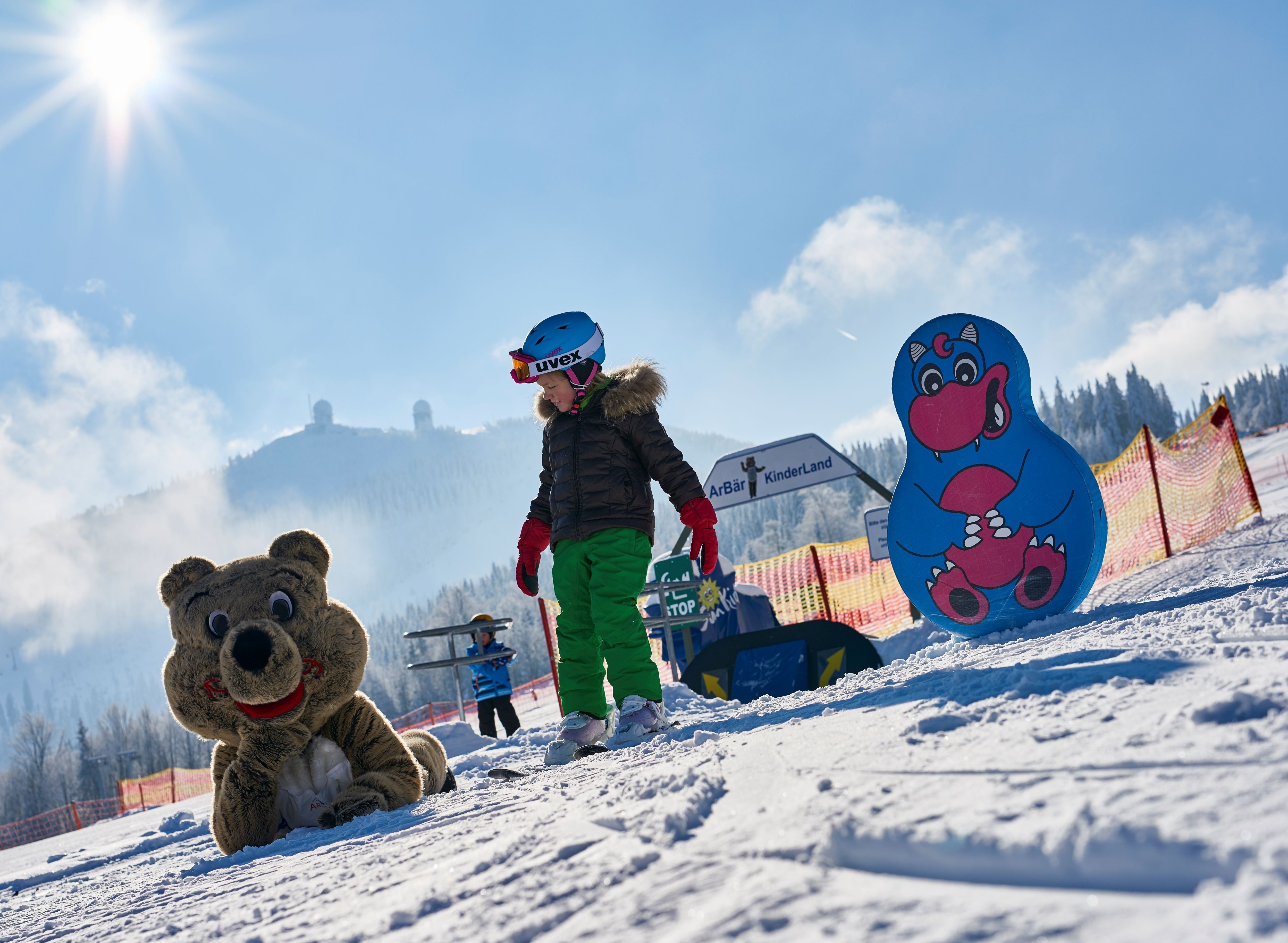 Das Maskottchen ArBär begleitet die Kleinen tatkräftig durch ihren Skitag. © Fürstlich Hohenzollernsche ARBER-BERGBAHN e.K.