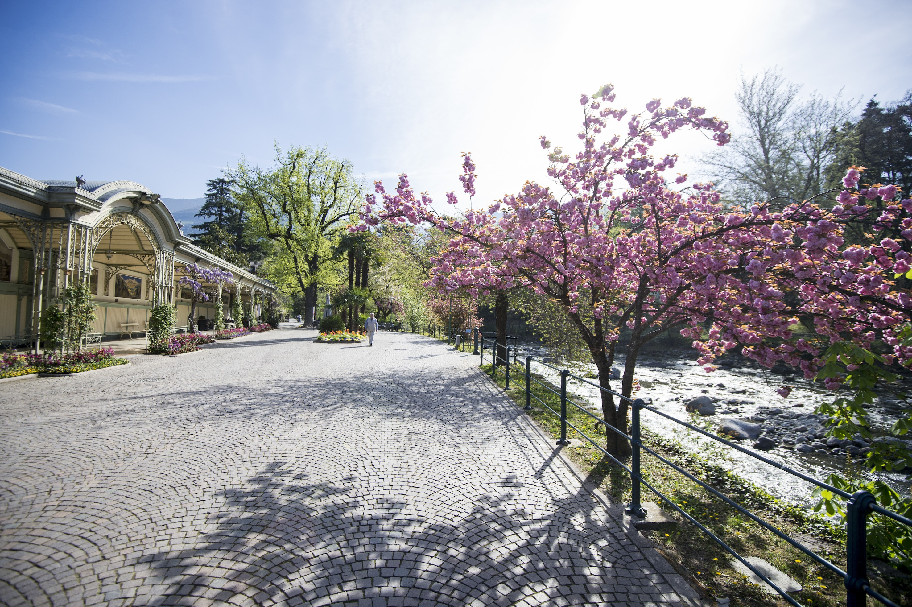 Das mediterrane Klima in Meran und Umgebung macht den Unterschied – in den vielen Gärten und Parks blühen ab März die Blumen, im April folgen die Mandel- und Apfelbäume, die uns mit ihrer Pracht und ihrem Duft betören. Über allem wiegen sich mit leichtem rascheln die Palmen im lauen Frühjahrslüftchen. Ein Cappucino auf der Piazza rundet das Dolce-Vita-Feeling ab. Die Sonne wärmt uns und zaubert einen frischen Teint.