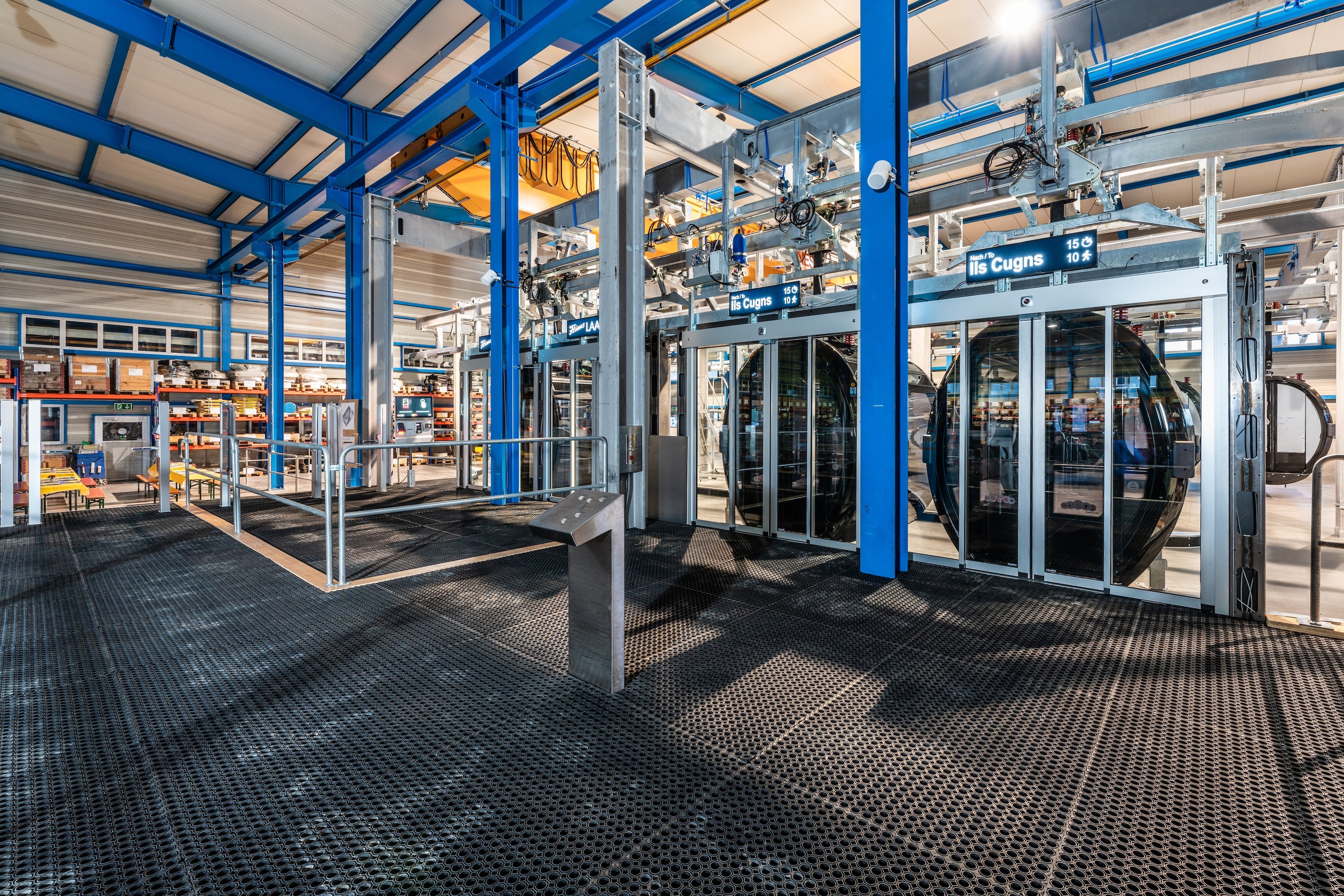 In der Station bewegen sich die Gondeln auf Laufschienen autonom mit eigenem Elektroantrieb.