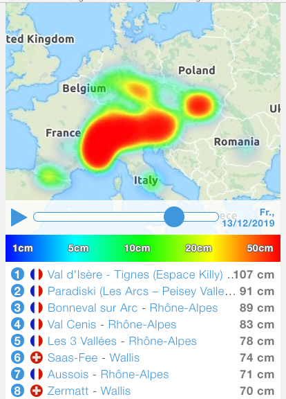 Vor allem in Frankreich und der Schweiz sowie in Vorarlberg werden zum Ende der Woche starke Schneefälle erwartet. Vielerorts sind mehr als ein Meter Neuschnee vorhergesagt. Besonders viel Schnee soll in Val d’Isère fallen. Ganze 175 Zentimeter sind hier gemeldet, 107 davon allein am Freitag, 13. Dezember.