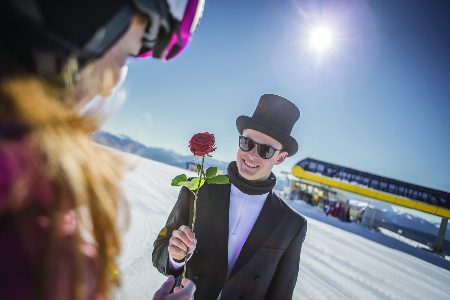 Zum Rosenkavalier wird der Pistenhelfer am Valentinstag. © Ski- und Almenregion Gitschberg Jochtal