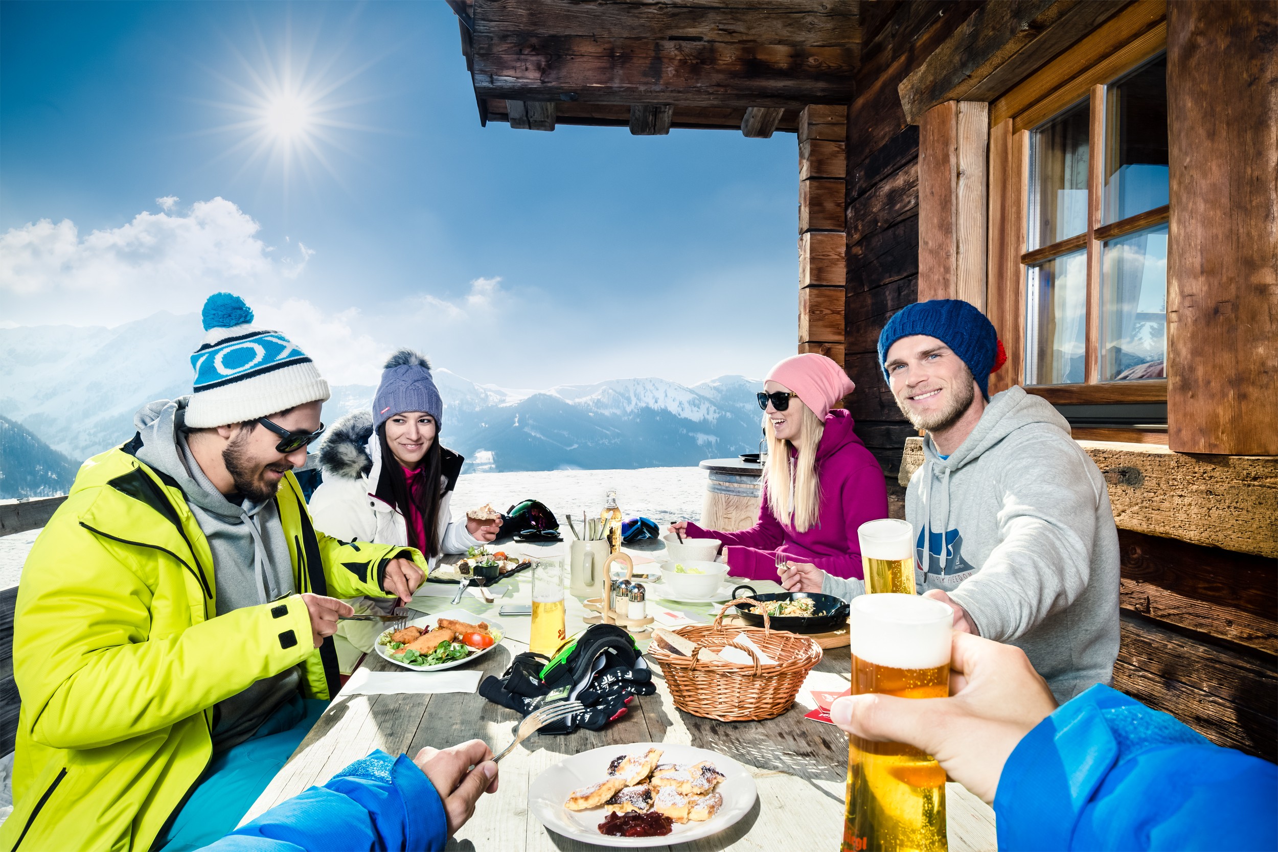 So können sich Skifahrer zur Stärkung nach zahlreichen Abfahrten im Flachauwinkel etwa in der Burgstallhütte mit dem O-Power-Suppentopf aufwärmen. Er besteht aus echter Rindsuppe, Gemüse, Fleisch und Nudeln. Vier-Hauben-Koch Rudi Obauer, von dem das Rezept stammt, weiß genau, was müden Muskeln wieder Kraft verleiht. Wer im Skigebiet Hochkönig seine Schwünge zieht, sollte bei der Steinbockalm einen Halt einlegen. Nach einem Rezept von Küchenchef Oliver Sprenger und Sternekoch Mario Lohninger wird hier „2erlei vom Pinzgauer Kalb“ serviert. Naschkatzen gönnen sich danach auf der Bürglalm einen Moar in der Pfoad, ein Schokoladenküchlein mit Beerensauce. Danach geht es wieder gestärkt auf die Piste!