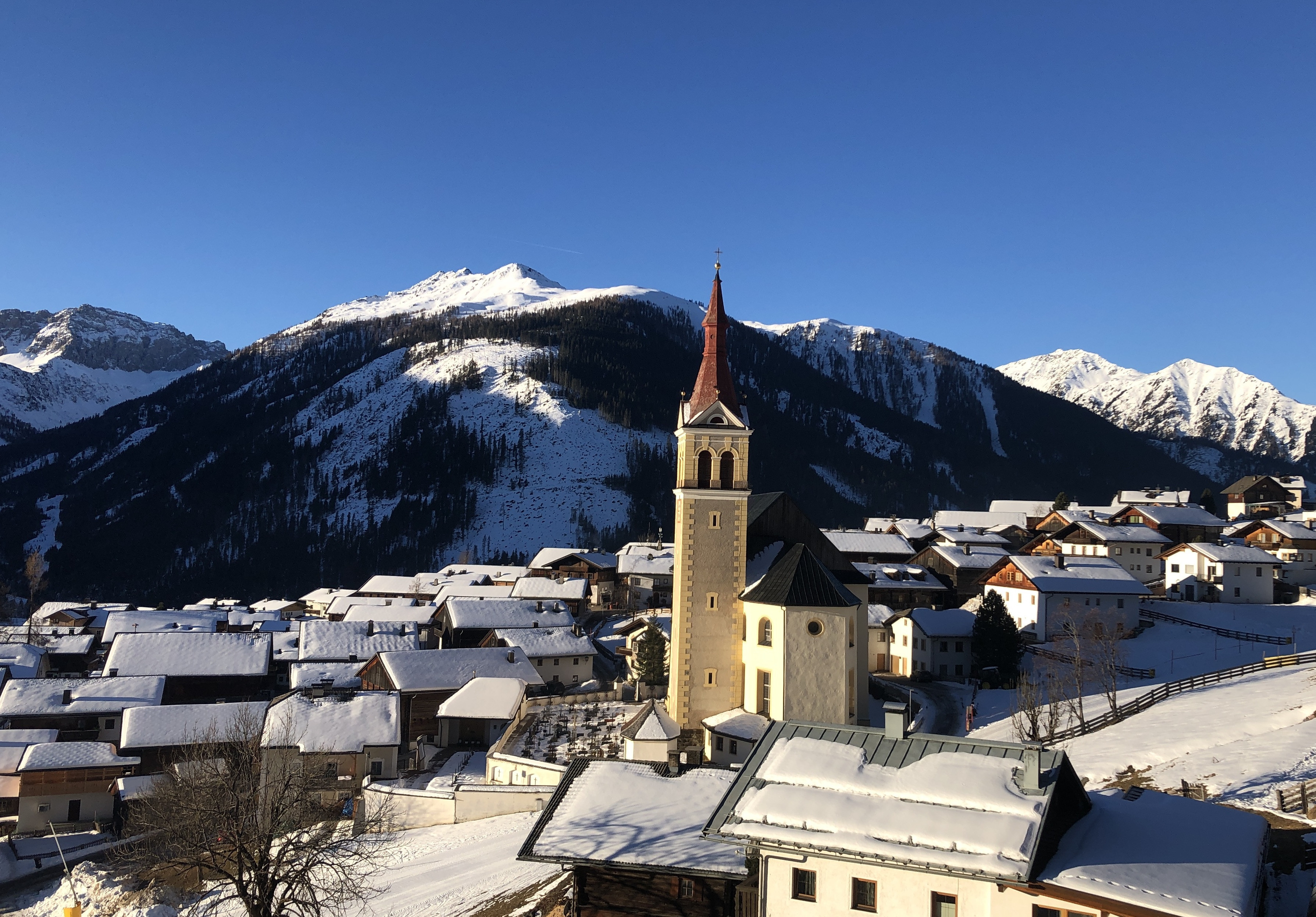Unser Langlauftag startet in Obertilliach. Das idyllische Haufendorf liegt auf 1.450 Metern Seehöhe und ist damit der höchste Ort im Osttiroler Lesachtal. Bei einem Spaziergang durch die engen, verwinkelten Gassen wird uns schnell klar, warum der Ortskern unter Denkmalschutz steht. Hier teilen sich Hotels und Bauernhöfe gleichermaßen den Platz im Dorf.