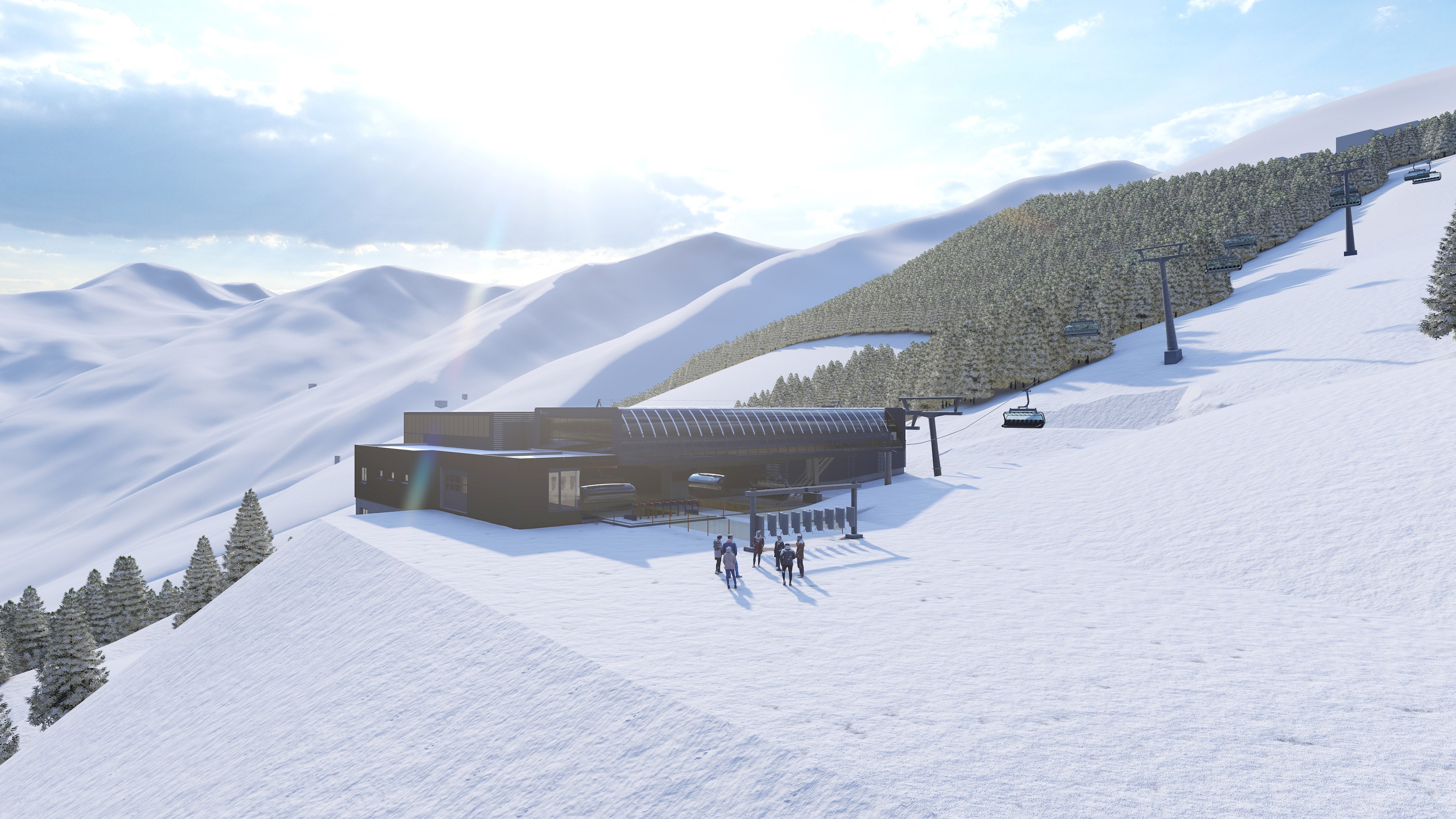 Das Gebäude der Talstation erhält eine Doppelnutzung. Im Untergeschoss wird nämlich ein Technikcenter mit Werkstätte, Büro, Lager und Platz für mehrere Pistengeräte geschaffen. Die Heizenergie für die Talstation wird von einer Wärmepumpe mit Tiefensonden bereitgestellt. Die großzügige Photovoltaik-Anlage an der südseitigen Fassade versorgt das Talstationsgebäude direkt mit grünem Eigenstrom.