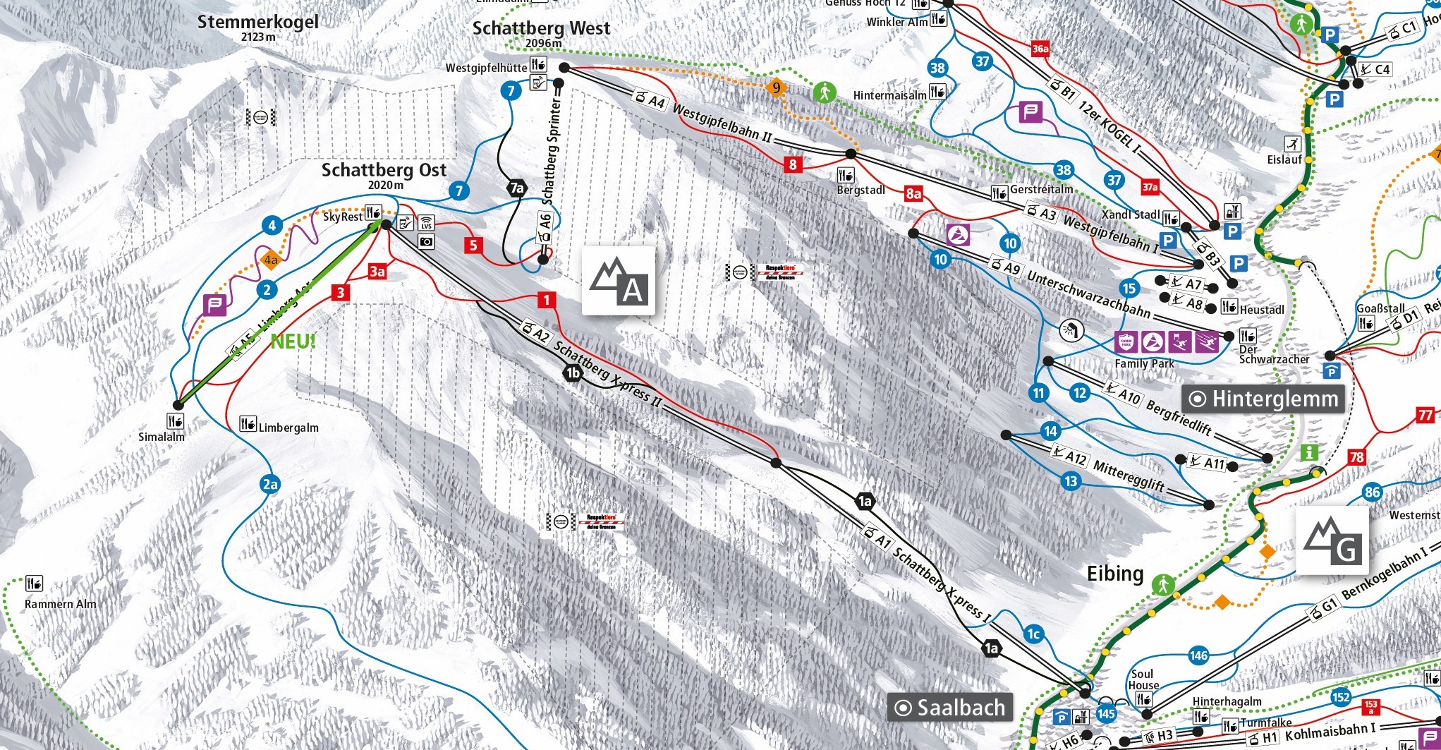 Mit 270 Pistenkilometern gehört der Skicircus zu den größten Skigebieten in Österreich und ist mit seinen 70 modernen Bahnen und den über 60 Einkehrmöglichkeiten auch eines der beliebtesten Ziele für Skifahrer und Snowboarder. Die Abfahrten verteilen sich auf die drei Gemeinden Saalbach-Hinterglemm, Leogang und Fieberbrunn.
