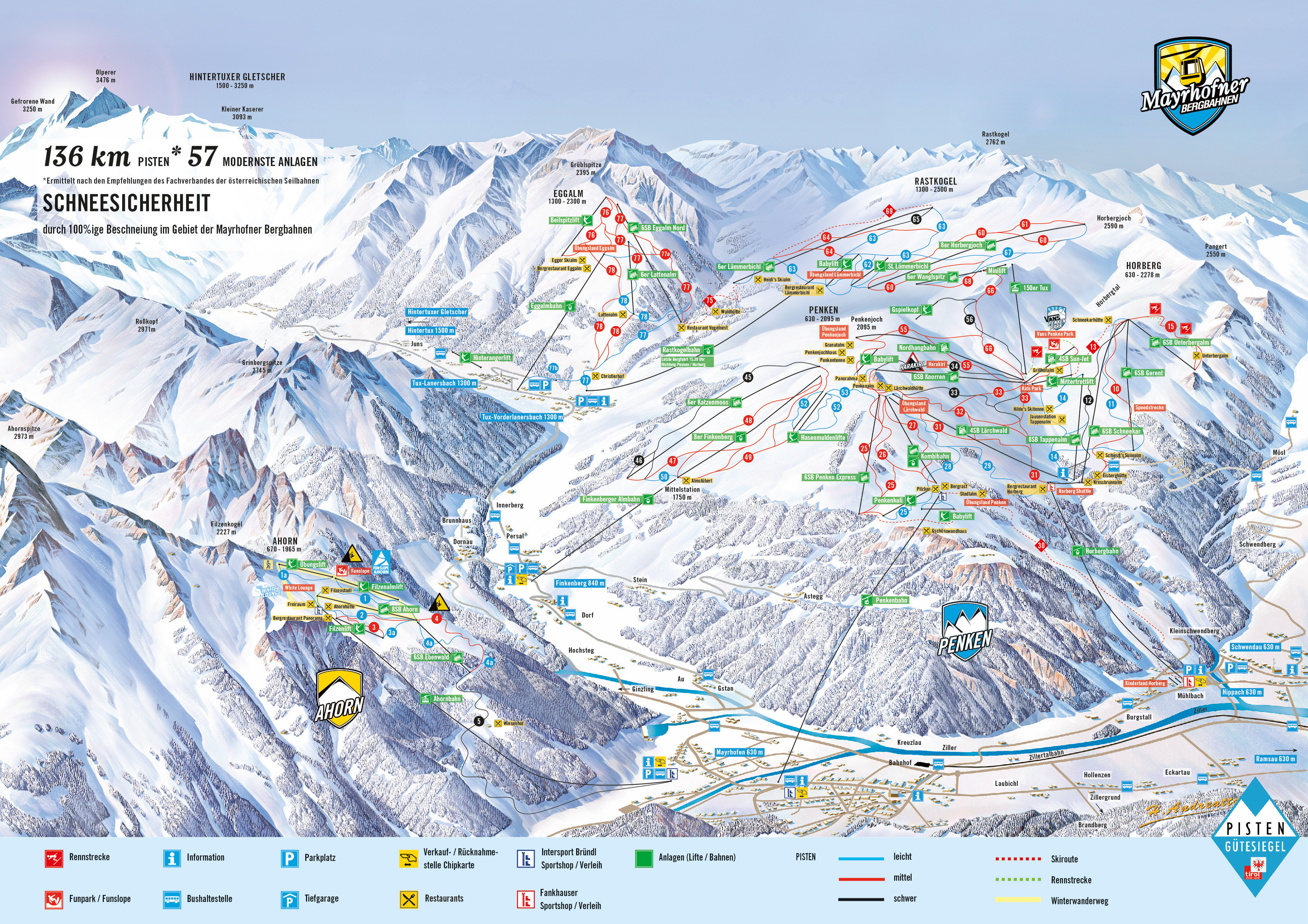 Insgesamt bietet das zusammenhängende Skigebiet an Penken, Rastkogel, Eggalm und Ahorn 136 Pistenkilometer und 57 Liftanlagen. Drei Viertel der Pisten sind rot und schwarz markiert und so vor allem für gute Skifahrer geeignet. Ins Skigebiet einsteigen kann man in den Talorten in Mayrhofen, Finkenberg, Lanersbach und Vorderlanersbach. Highlights sind in sportlicher Hinsicht sicherlich die schwarze Harakiri-Abfahrt und der große Vans Penken Park. In kulinarischer und architektonischer Hinsicht sollte man sich die aus Eis gefertigte White Lounge am Ahorn sowie die pyramidenartige Schneekarhütte nicht entgehen lassen.