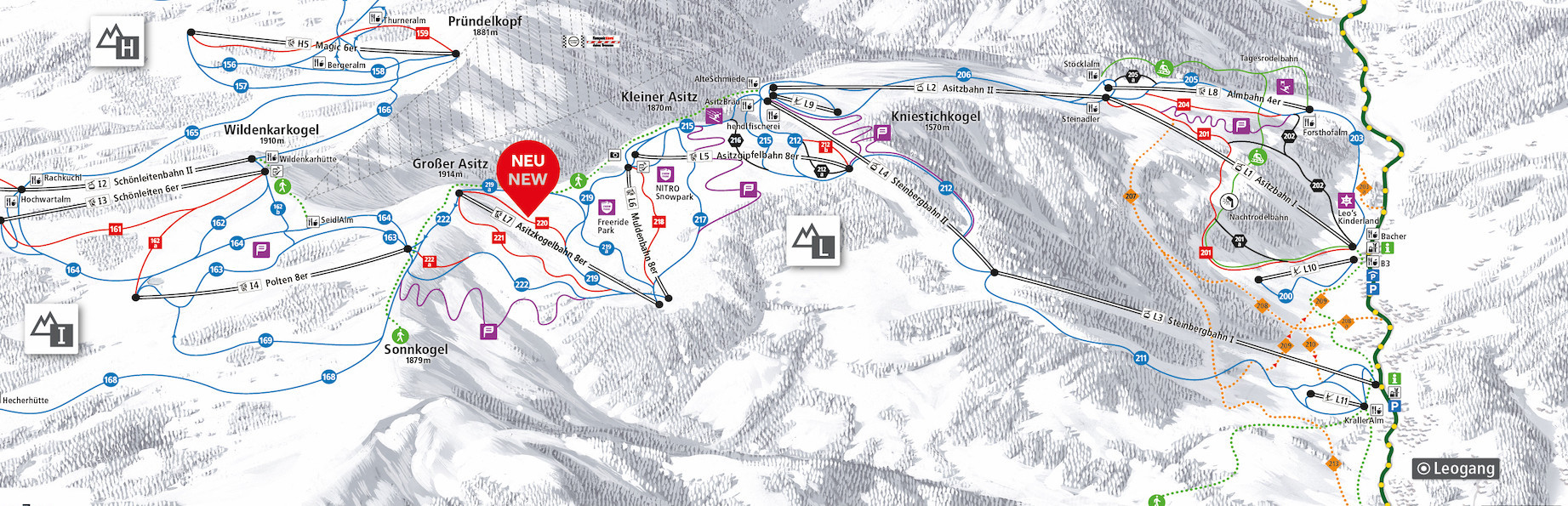 Auf Hochtouren laufen aktuell in Leogang die Bauarbeiten für eine neue 8er Sesselbahn inklusive Stationsgebäude. Die Asitzkogelbahn wird auf der identischen Trasse wie die Vorgänger-Sportbahn verlaufen, wird aber durch ihre höhere Förderkapazität das letzte Nadelöhr zwischen Leogang und Saalbach beseitigen. Die Eröffnung der neuen Bahn ist zum Start der Skisaison Ende November 2022 geplant.