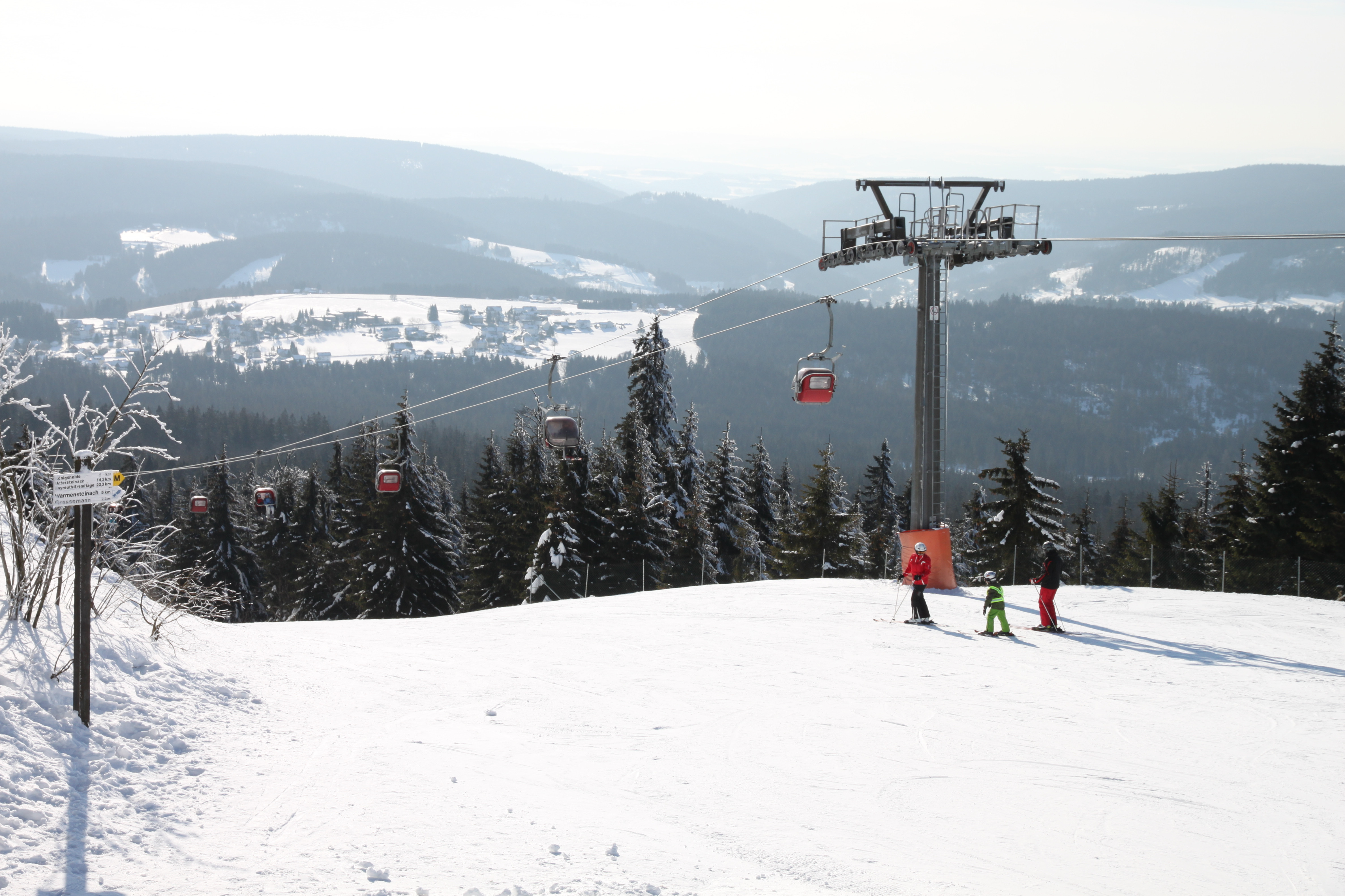 Der Ochsenkopf nordöstlich von Bayreuth ist ein beliebtes Wintersportgebiet im Fichtelgebirge. Mit den beiden längsten Pisten in Nordbayern – die rote Nordabfahrt ist 2.300 Meter, die blaue Südabfahrt 1.900 Meter lang – bietet das Skigebiet mehr als vier Abfahrtskilometer und damit reichlich Skivergnügen für Anfänger und Fortgeschrittene. Neben den beiden Seilbahnen gibt es im Talbereich in Bischofsgrün an der Nordseite sowie in Fleckl an der Südseite noch kürzere Übungslifte mit Anfängerarealen.