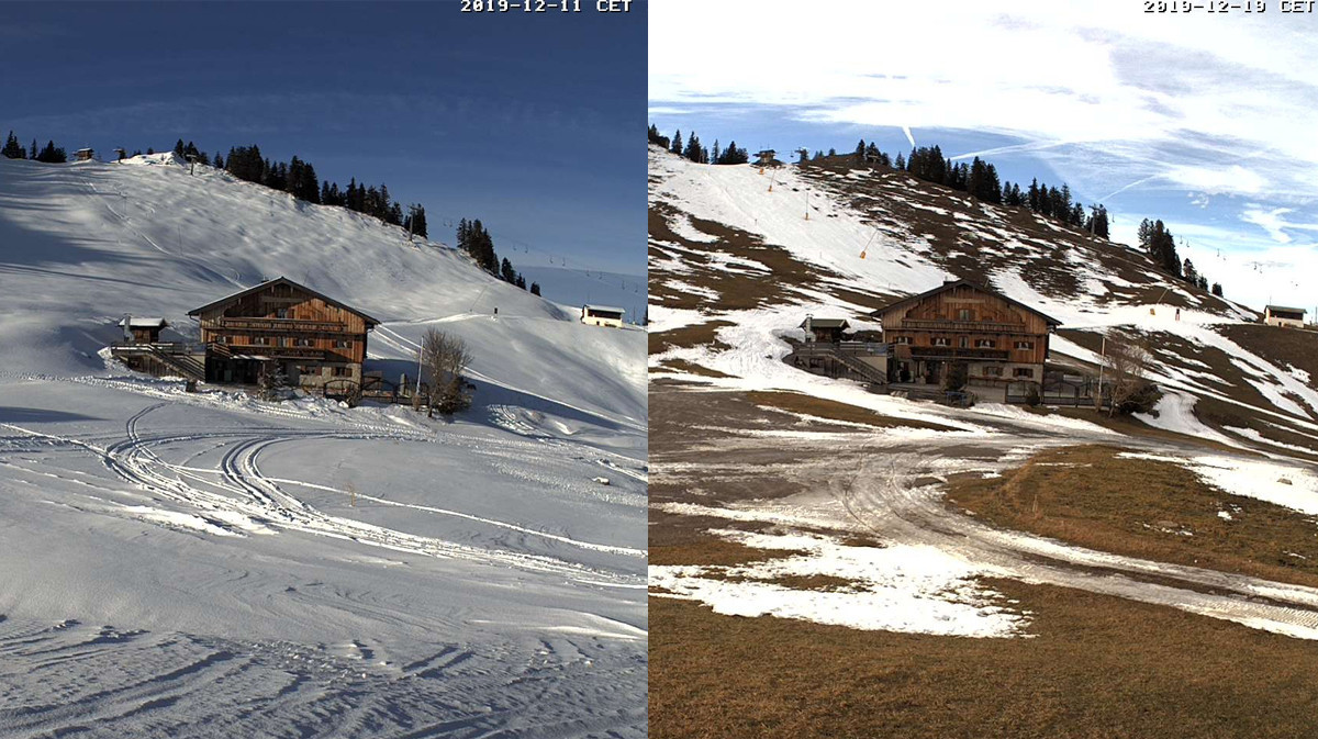 Der Südföhn der letzten Woche hat den Schneelagen in den Bergen stark zugesetzt. Vor allem den Skigebieten in niedrigeren Lagen und in Deutschland bereitet das warme Wetter aktuell große Probleme. Waren die Mittelgebirge und die bayerischen Alpen vor einer Woche noch weiß, sind die Wiesen kurz vor Weihnachten wieder grün.