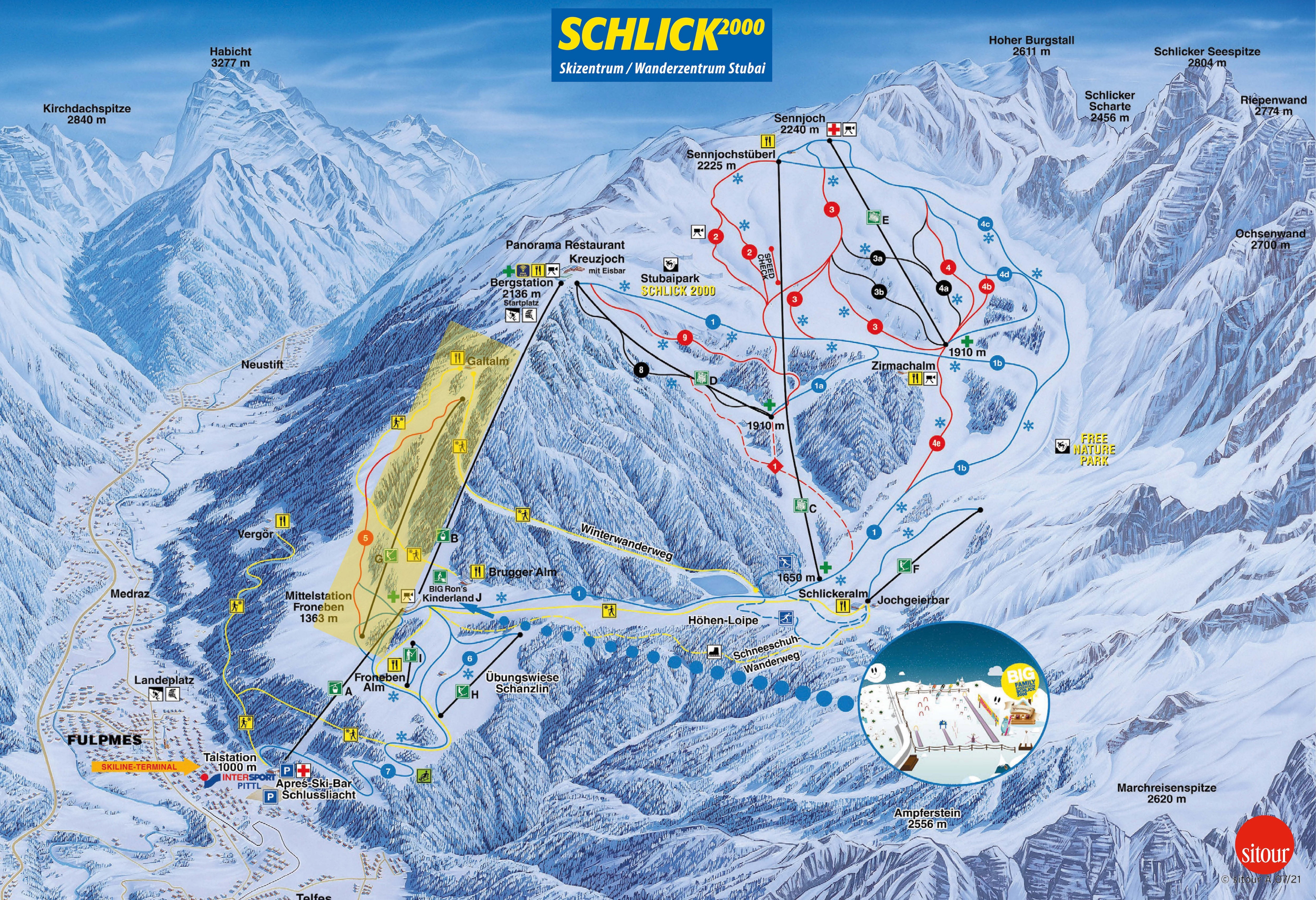 Die Schlick 2000 im vorderen Stubaital ist sowohl bei Familien als auch bei fortgeschrittenen Skifahrern und Freeridern beliebt. Nur eine knappe halbe Stunde von Innsbruck entfernt bietet das Skigebiet bei Fulpmes 19 Abfahrten mit 22 Pistenkilometern.